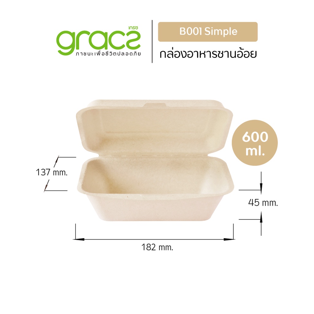 GRACZ กล่องอาหาร 600 ml.รุ่น B001 (แพ็ก 50 ชิ้น) (เกรซ ซิมเปิล)กล่องใส่อาหาร ชานอ้อย เข้าไมโครเวฟได้