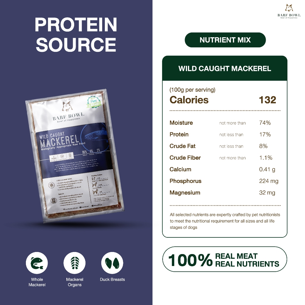 บาร์ฟสุนัข- BARF สูตรปลาแมคเคอเรลผสมเป็ด l 500g - (Nutrient mix) WILD CAUGHT MACKEREL
