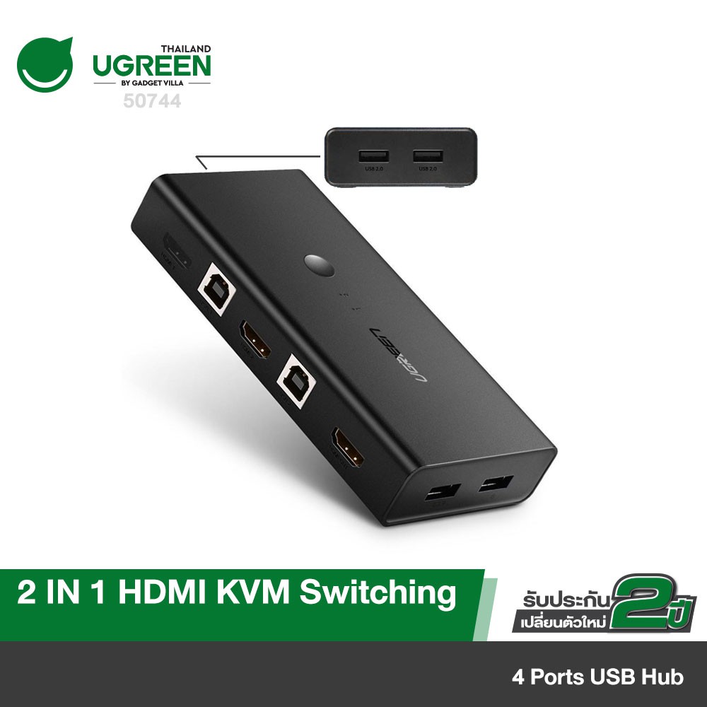 UGREEN รุ่น 50744 HDMI Switch Box 2 In 1 Out KVM Switching HDMI and Extended 4 Ports USB Hub Sharing