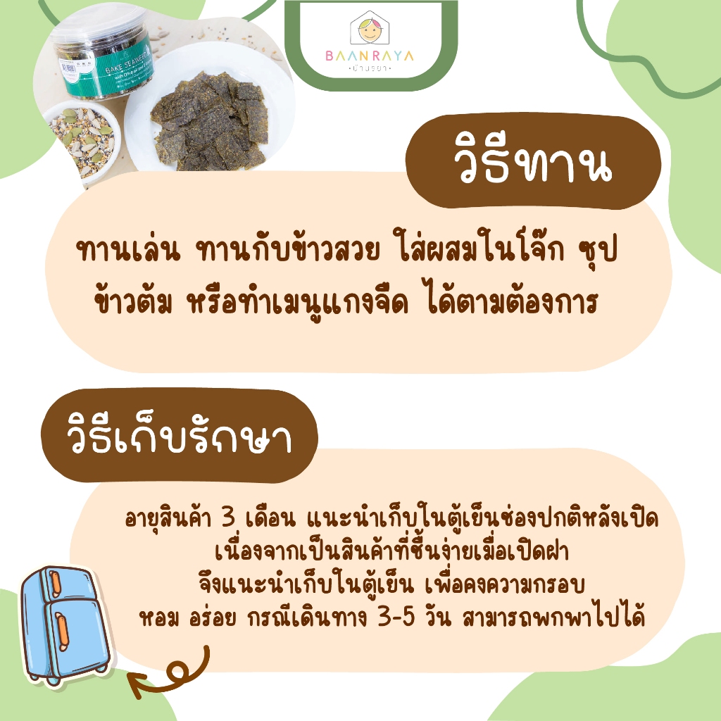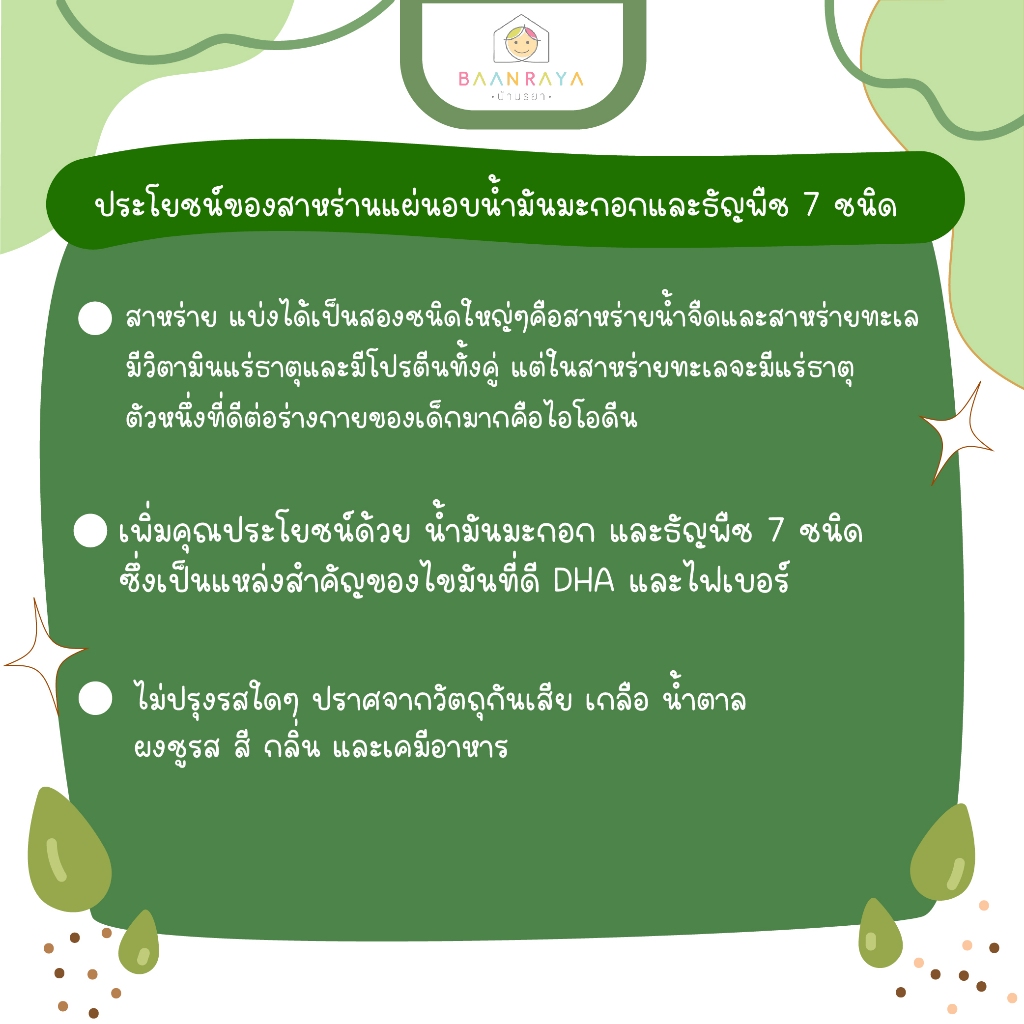 ขนมสำหรับเด็ก สาหร่ายแผ่นอบน้ำมันมะกอก และธัญพืช 7 ชนิด 15g อาหารเด็ก อาหารสำหรับเด็ก บ้านรยา (9m+)