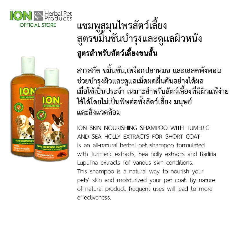 ION SS500 แชมพูสมุนไพร สูตรขมิ้นชัน บำรุงขนและดูแลผิวแพ้ง่าย สำหรับสุนัขและแมว ขนสั้น Skin Nourishing Shampoo 500ml