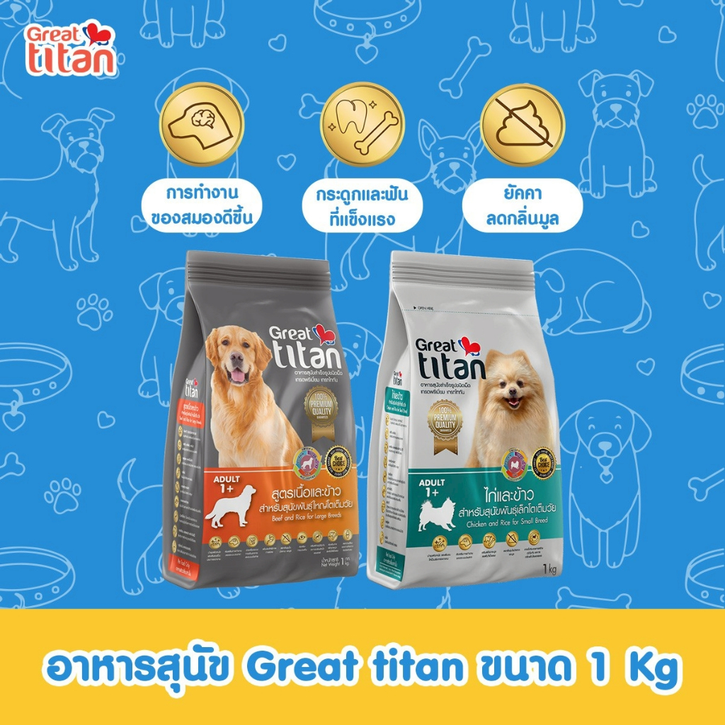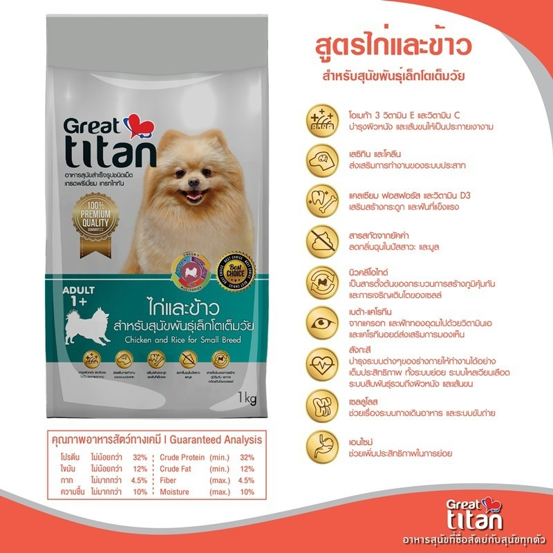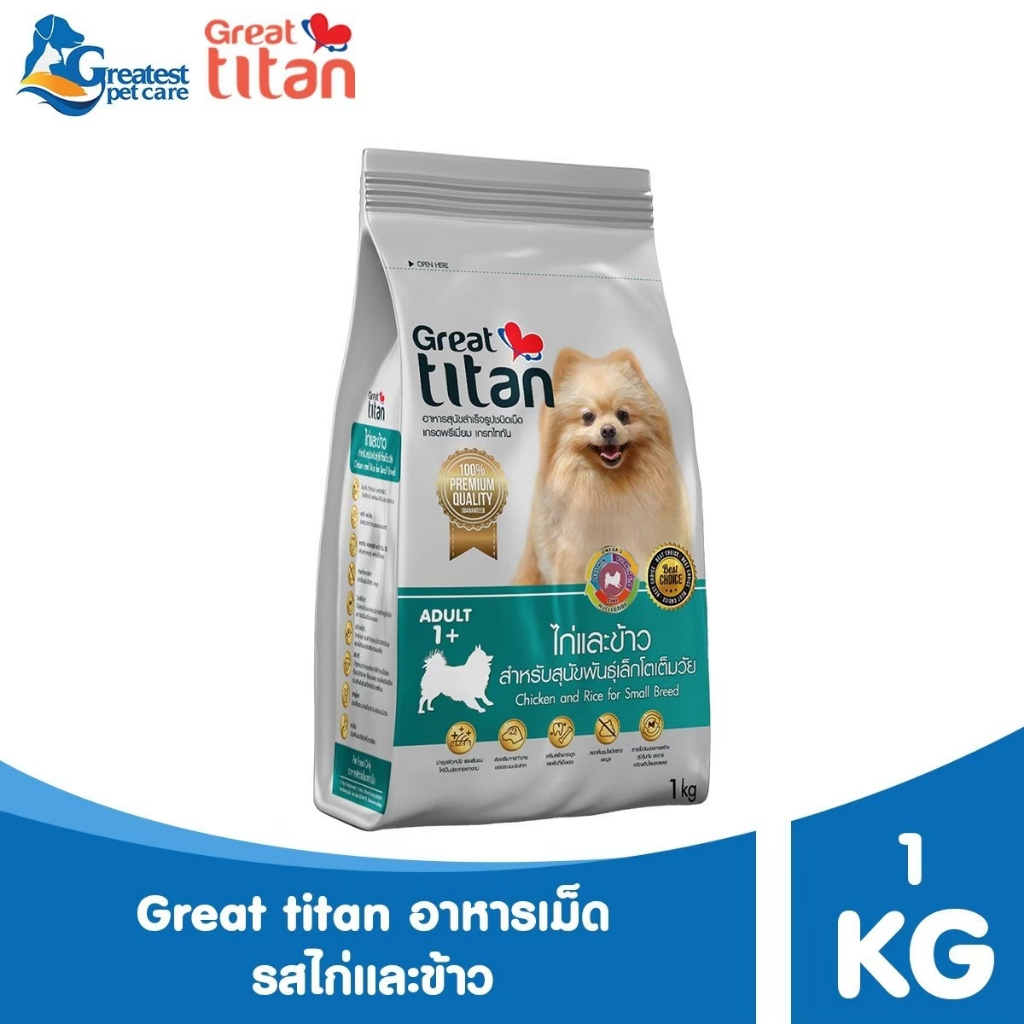 Great titan รสไก่และข้าว ขนาด 1 kg. อาหารเม็ดเกรดพรีเมี่ยม สำหรับสุนัขสายพันธุ์เล็กทุกสายพันธุ์