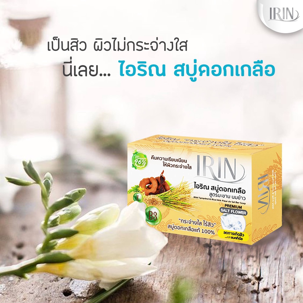ไอริณ สบู่ดอกเกลือทะเล ลดความมัน ฆ่าเชื้อ ด้วย สารธรรมชาติ (แพ็ค 100กรัมx4 สุดคุ้ม) สูตรมะขาม นมข้าว
