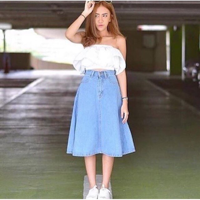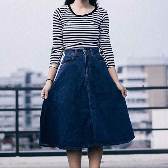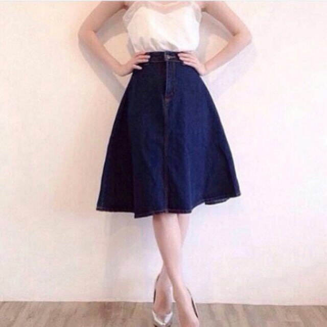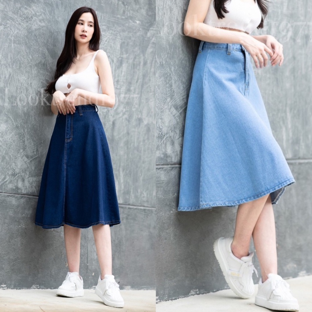 [พร้อมส่ง S-XL] Fineday Jeans. กระโปรงยีนส์ ตัวยาว เอวสูง ทรงสวิง คลุมเข่า ผ้าไม่ยืด ยีนส์นิ่ม ยาว 27-28 นิ้ว