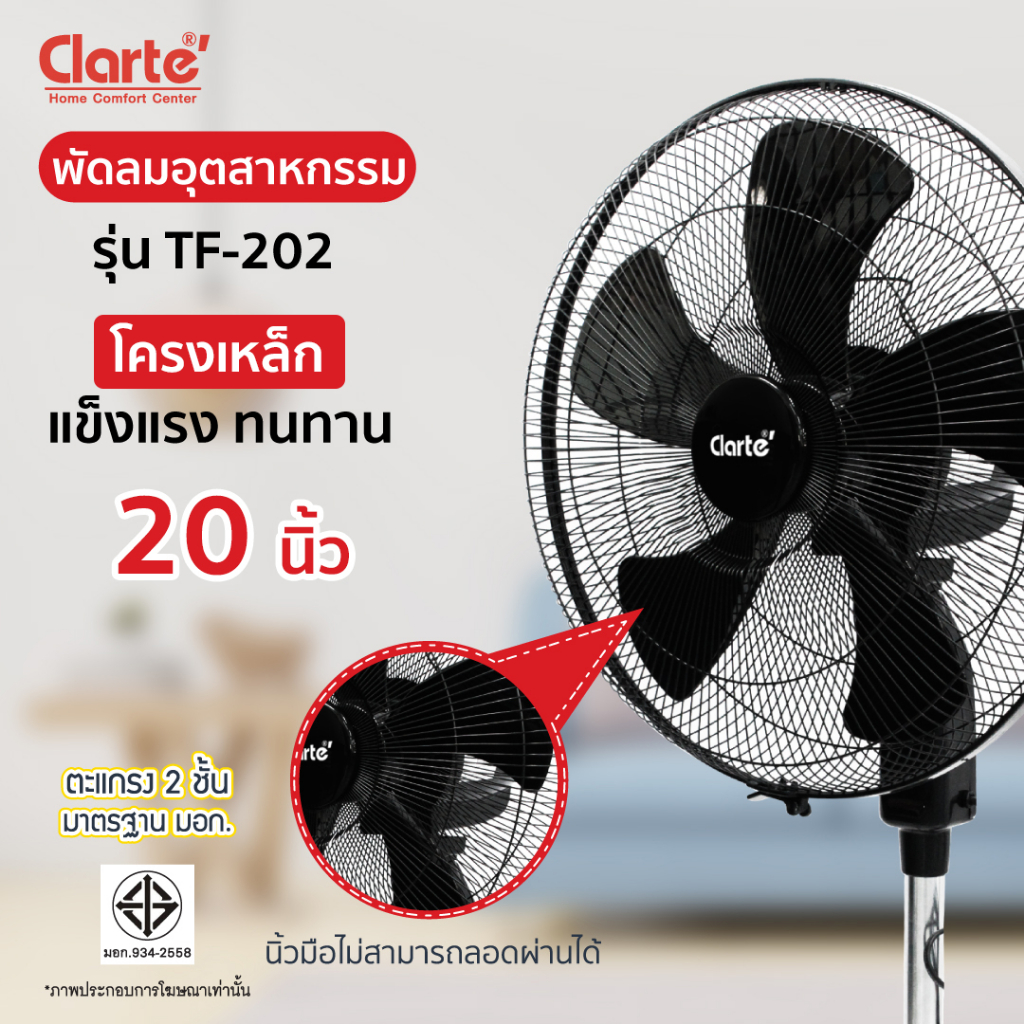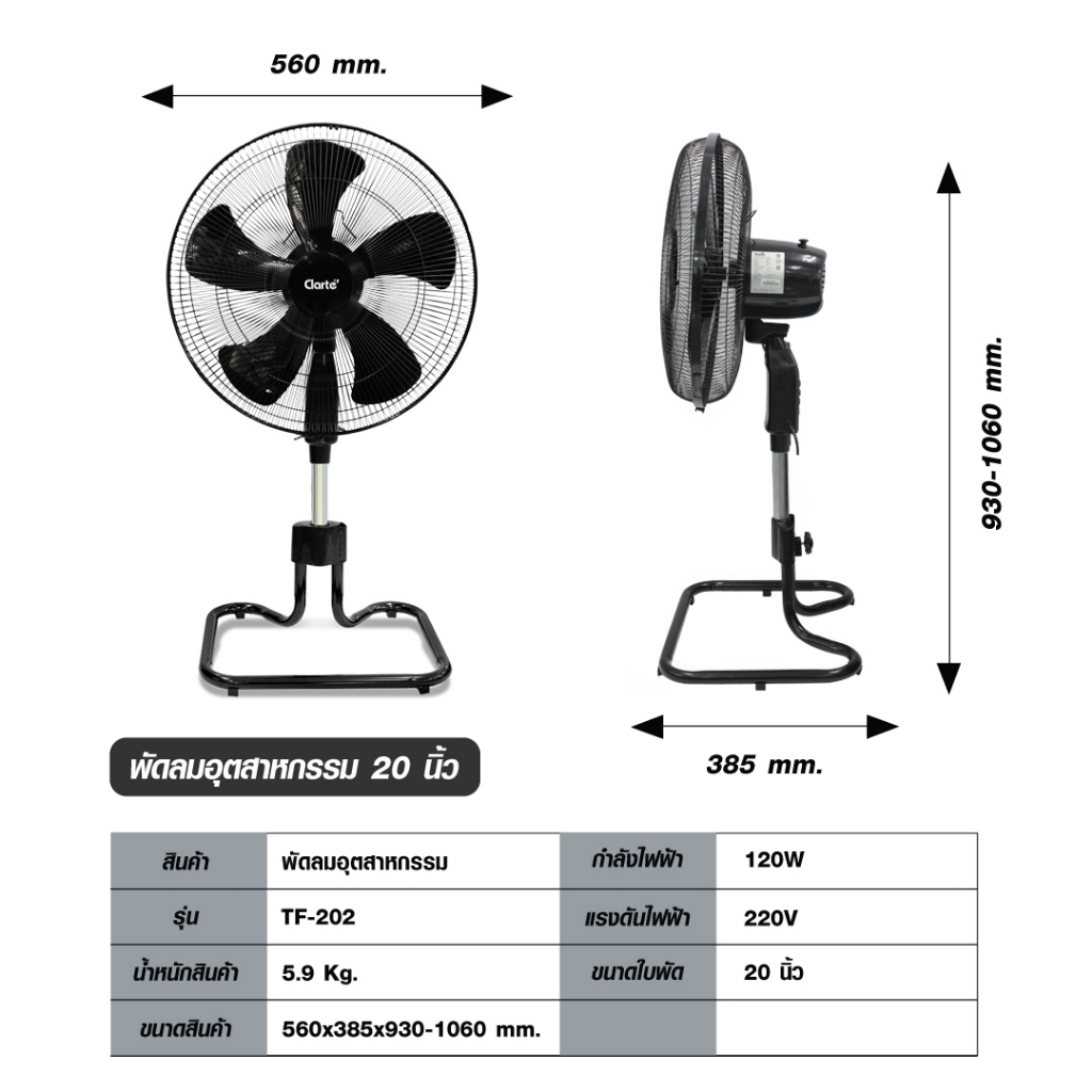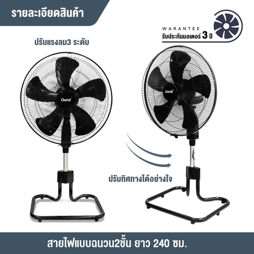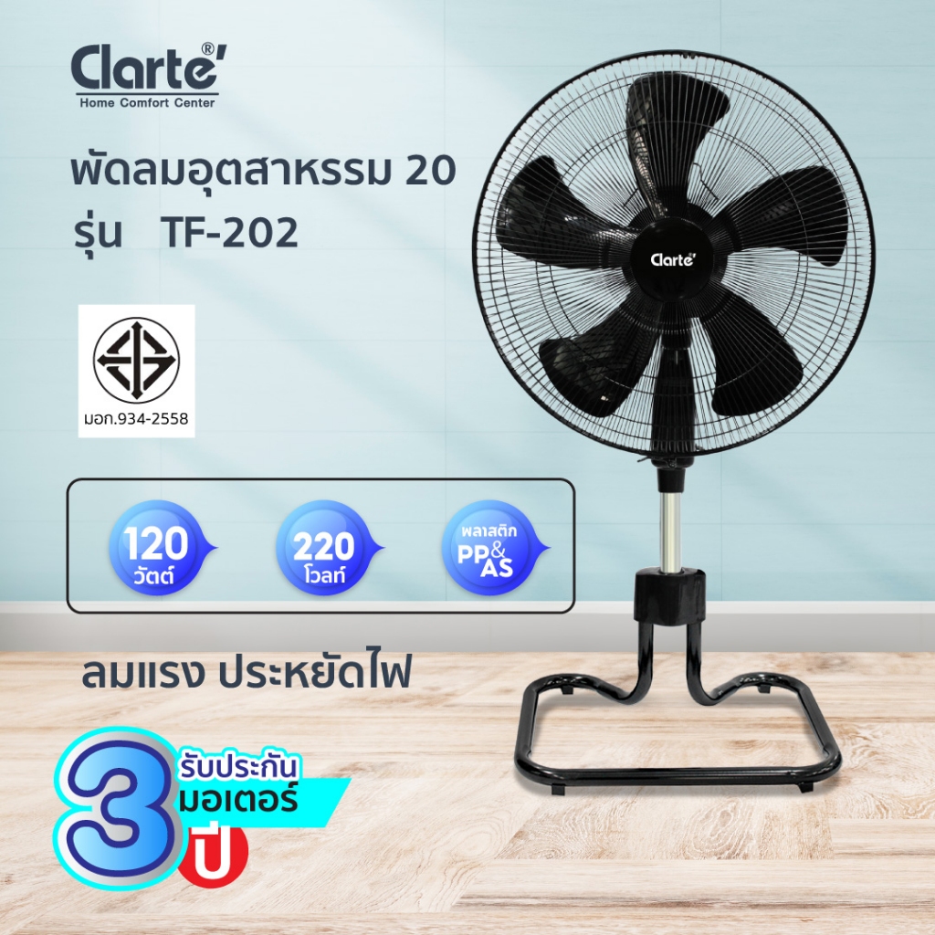 Clarte'พัดลมอุตสาหกรรม20 นิ้ว5 ใบพัดCTTF-202สีดำลมแรงเสียงเงียบพร้อมส่ง