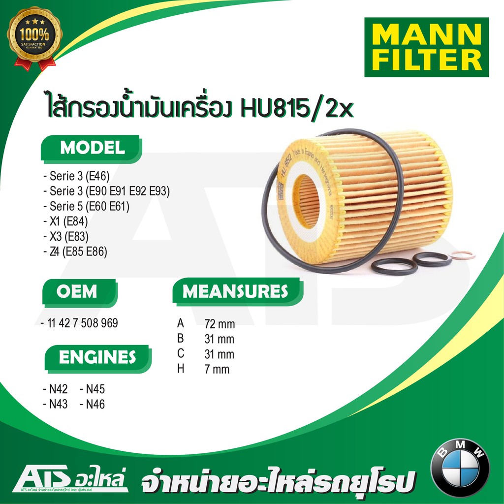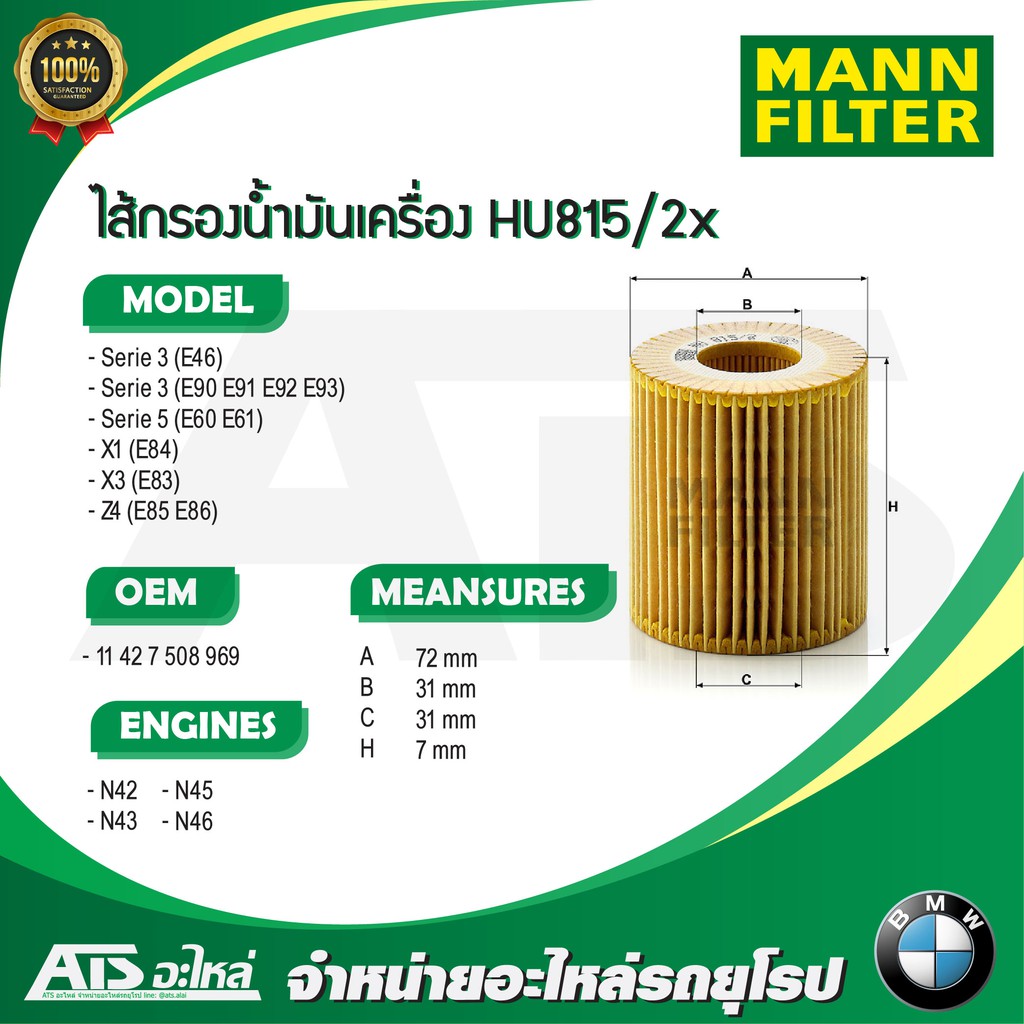 BMW กรองเครื่อง (Oil Filter) MANN FILTER HU815/2X เครื่อง N40 N42 N43 N46 รุ่น E46 E90 X1 ( E84 ) X3 ( E83 ) Z4