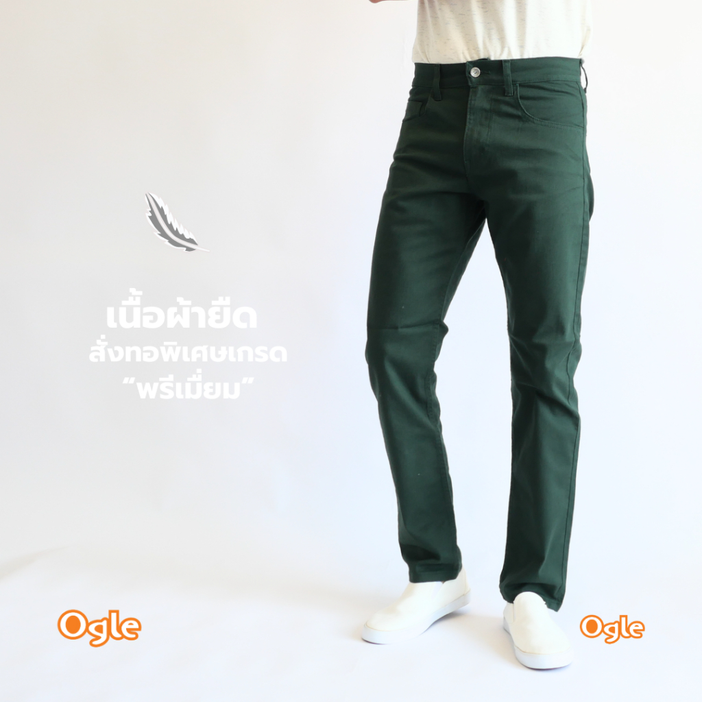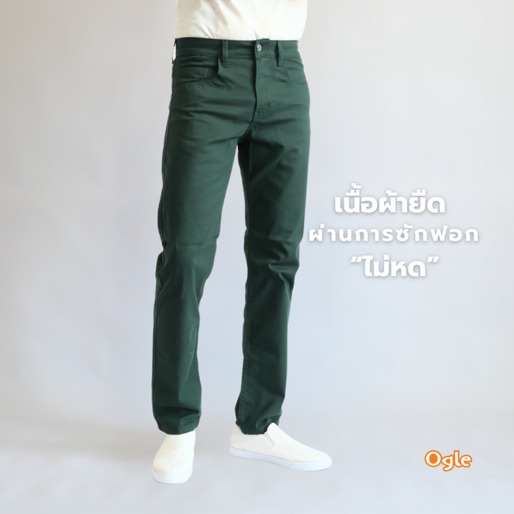 กางเกงขายาวชิโน่ ผ้าฟอกนุ่ม ทรงกระบอกเล็ก สีเขียว