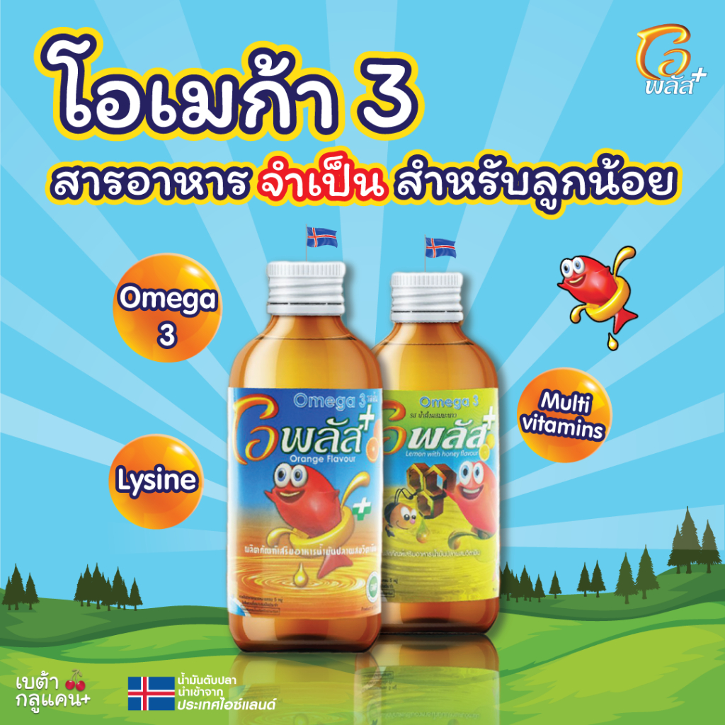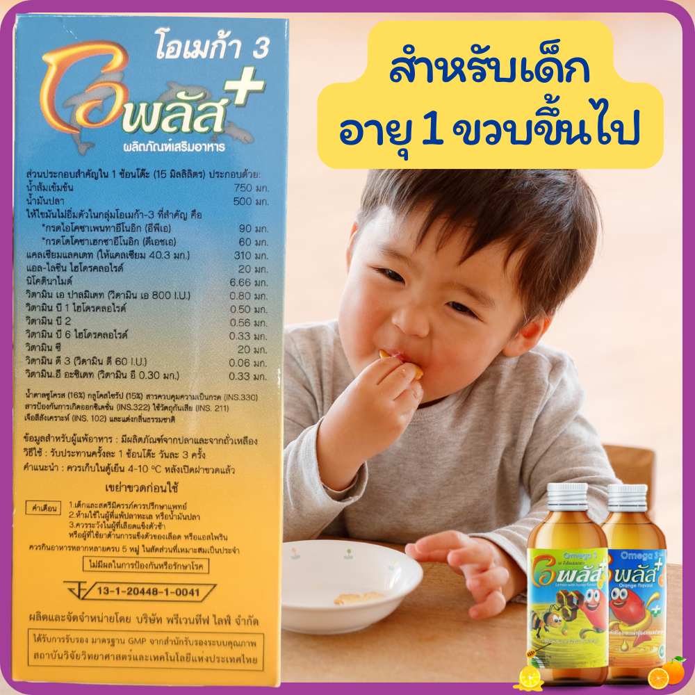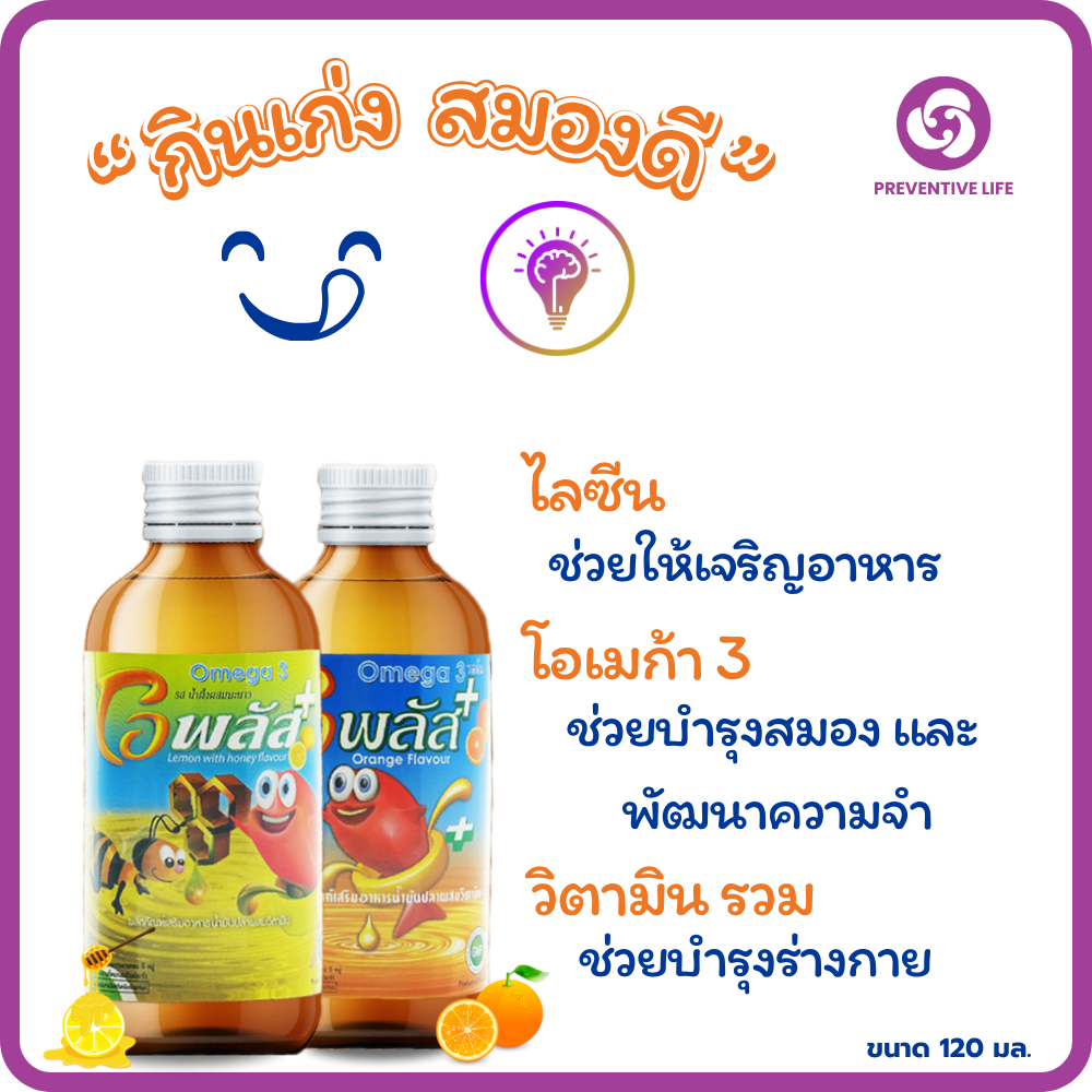 O-Plusโอเมก้า 3 น้ำมันปลา รสส้ม-น้ำผึ้งผสมมะนาว วิตามินรวม บำรุงสมอง เจริญอาหาร(แถมฟรีฟริสซี 1 ซอง )