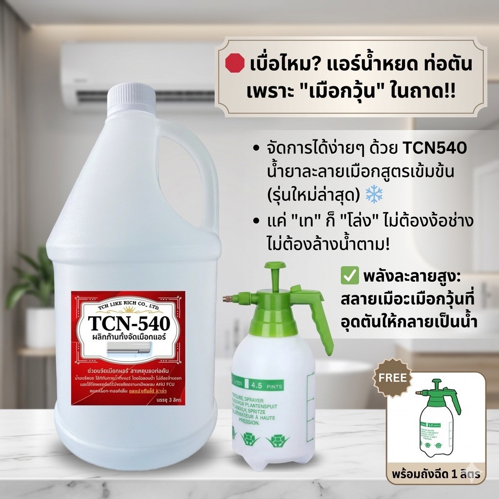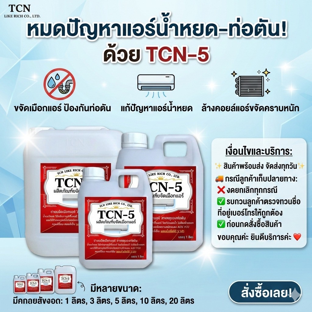 TCN5 น้ำยาละลายเมือก ในถาดน้ำทิ้ง ช่วยกำจัดเมือกที่จับตัวเป็นก้อนวุ้นที่เป็นสาเหตุให้ท่อแอร์ตัน ขจัดเมือกในคอยล์แอร์