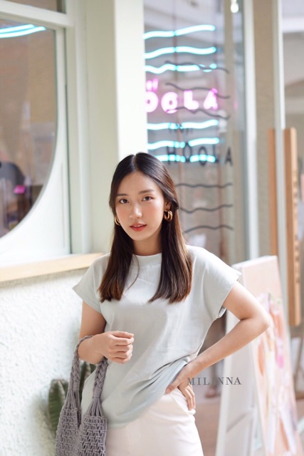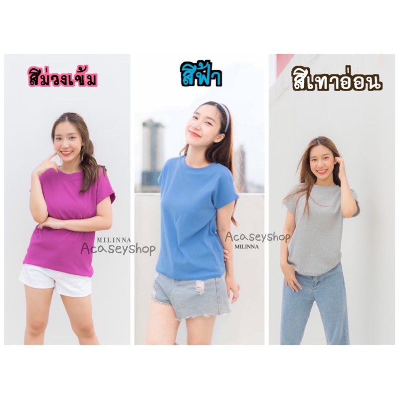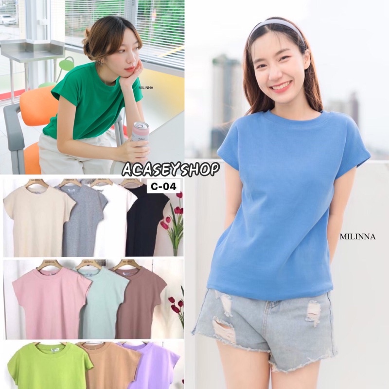 Acasey เสื้อยืดผู้หญิง คอกลมแขนเต่อ เนื้อผ้าร่องคอนตอน เนื้อนุ่ม ใส่ได้ทุกวัน c-04