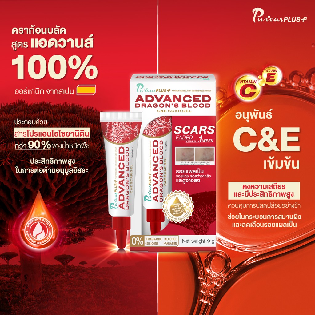 Puricas Plus Advanced Dragon's Blood C&E Scar Gel ขนาด 9 กรัม เจลลดรอยแผลเป็น