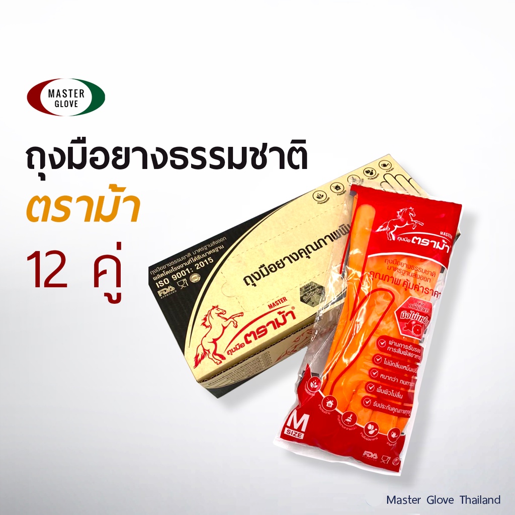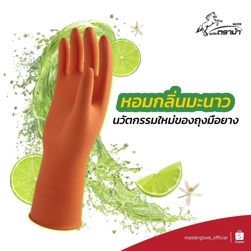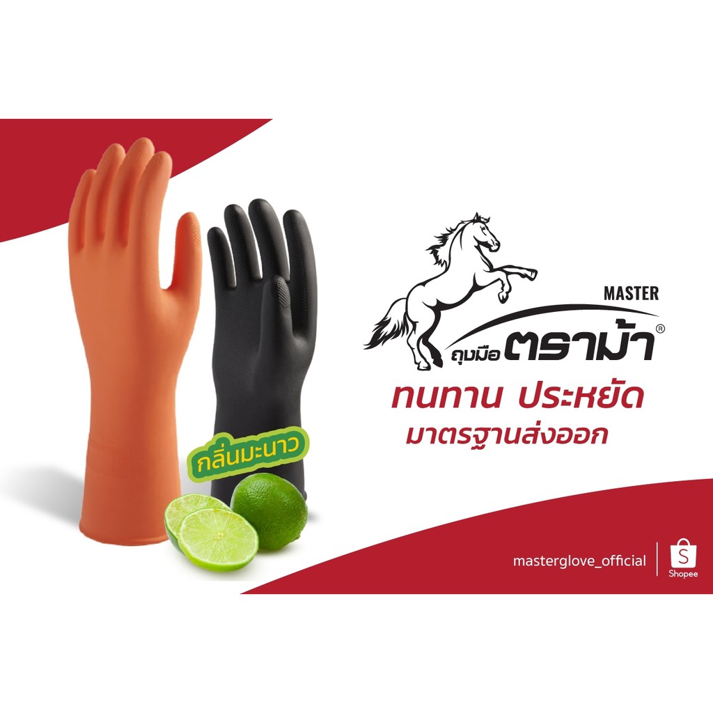 12 คู่ (1โหล) - ถุงมือยาง "ตราม้า" สีส้ม/สีดำ/สีฟ้า กลิ่นมะนาว มือไม่เหม็น ถุงมือแม่บ้าน (Food Safe)