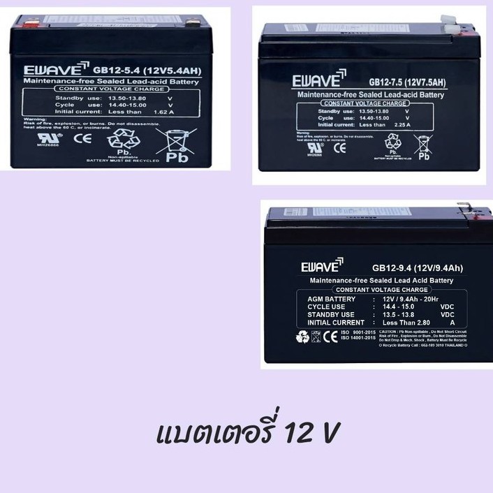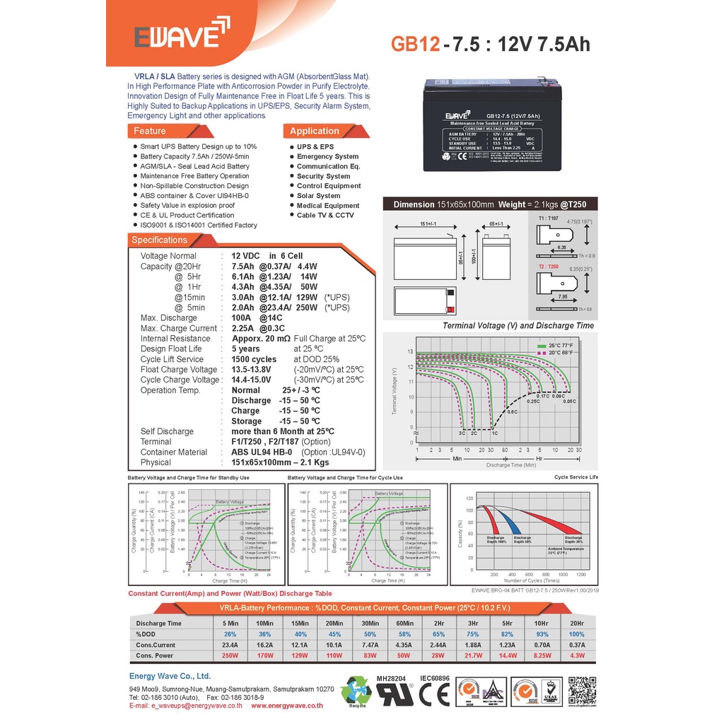 แบตเตอรี่ UPS Battery EWAVE 12V 7.5A / แบ็ต UPS รุ่น GB 12V 7.5Ah(แบตเตอรี่แห้ง สำรองไฟ ไฟฉุกเฉิน)