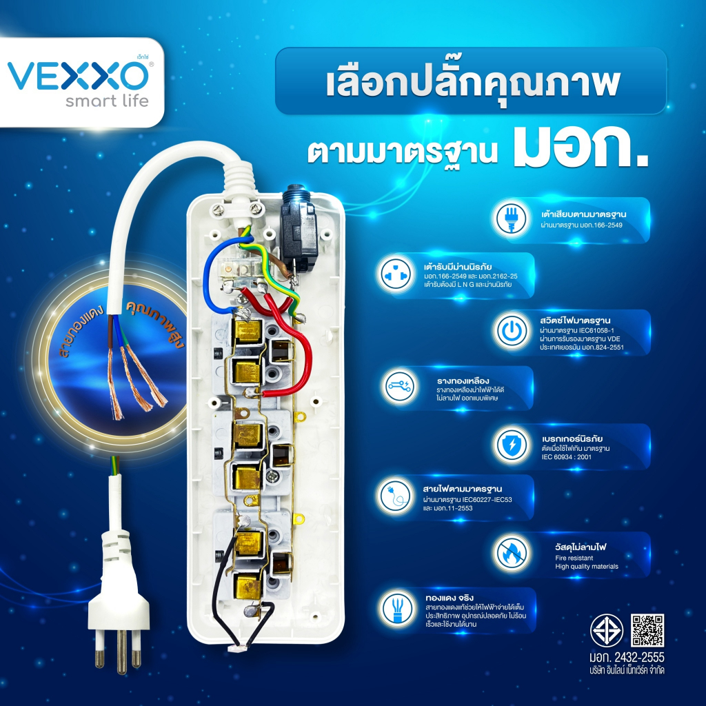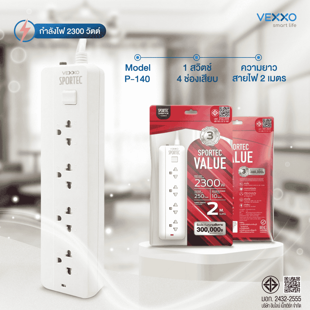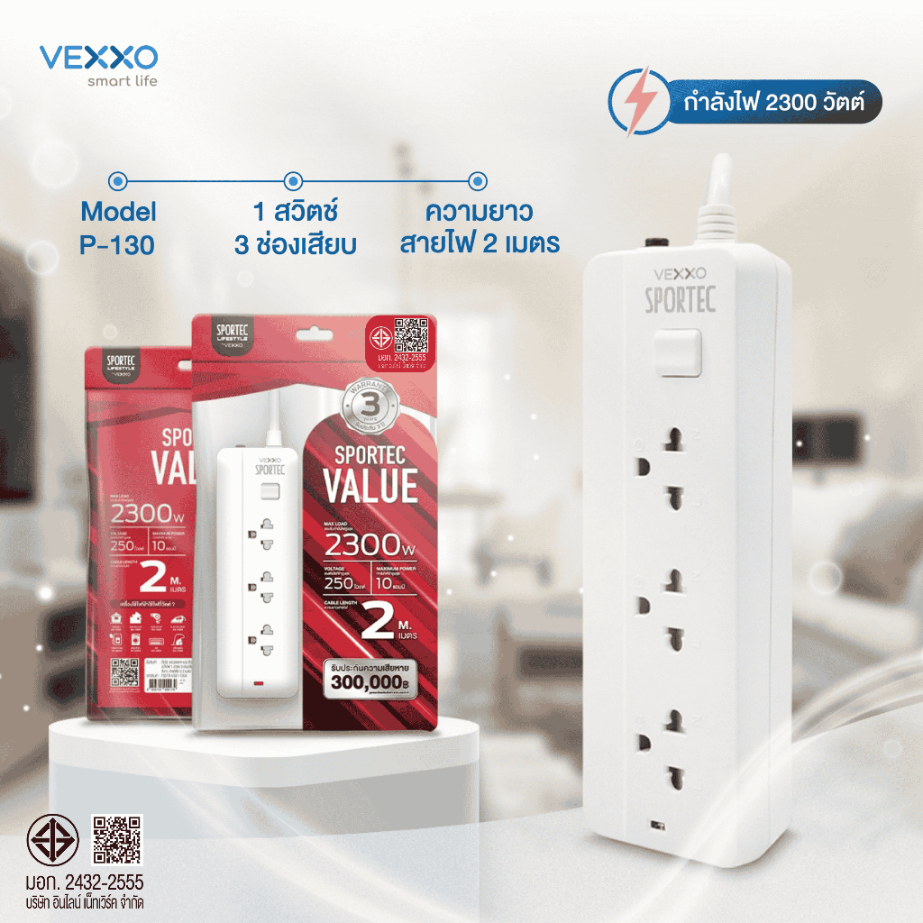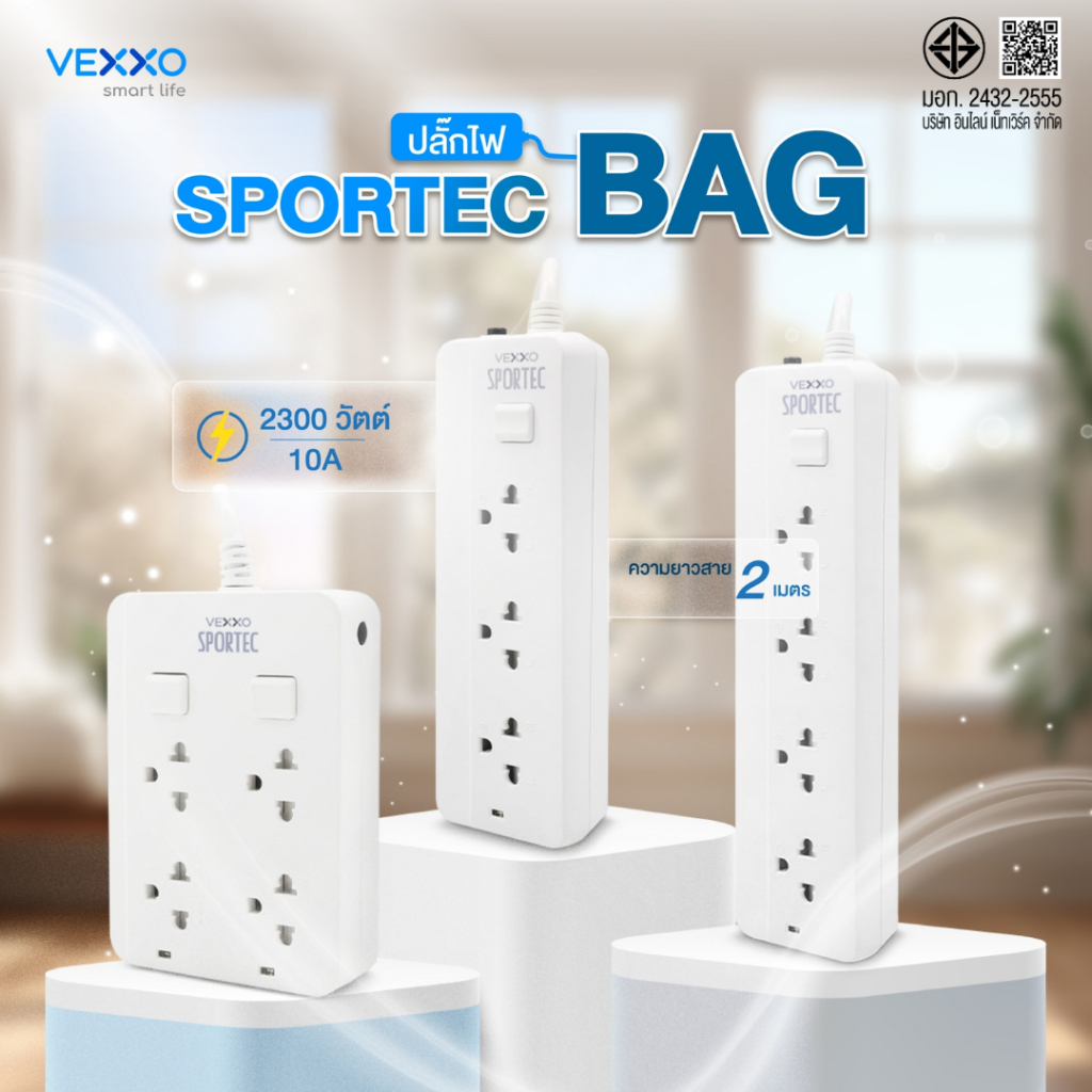 ปลั๊กไฟ Vexxo Sportec Bag (10A 2300W) ปลั๊กไฟมอก. : สายยาว 2 เมตร