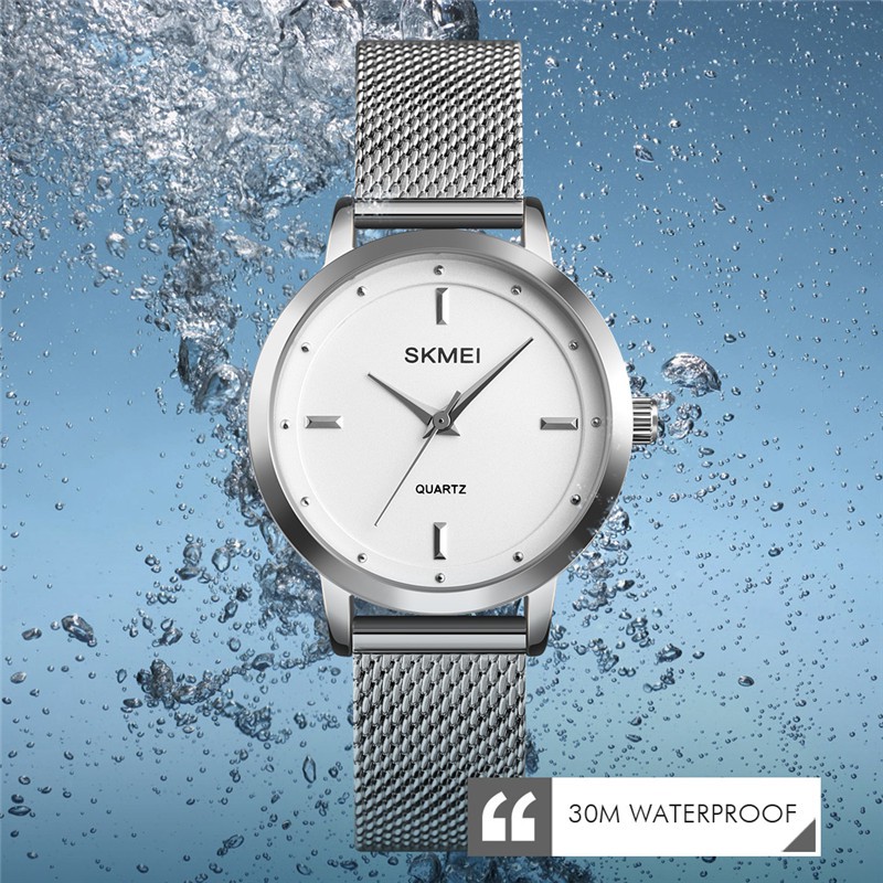 SKMEI นาฬิกาข้อมือสายสแตนเลสกันน้ำ 30 เมตรสำหรับผู้หญิง