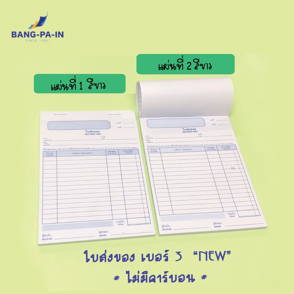 BANG PA IN ใบส่งของ เบอร์ 2 และเบอร์ 3 (1ชุด 2 แผ่น) แบบไม่มีคาร์บอน ไม่มีปกหน้าหลัง เนื้อใน 30 ชุด Lot ผลิตใหม่