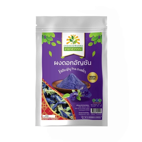 ผงดอกอัญชันอบแห้ง 100 กรัม คุณภาพ A+ สมุนไพร Dried Butterfly Pea ตรา ชาดาสุวรรณ์ Chadasuwan