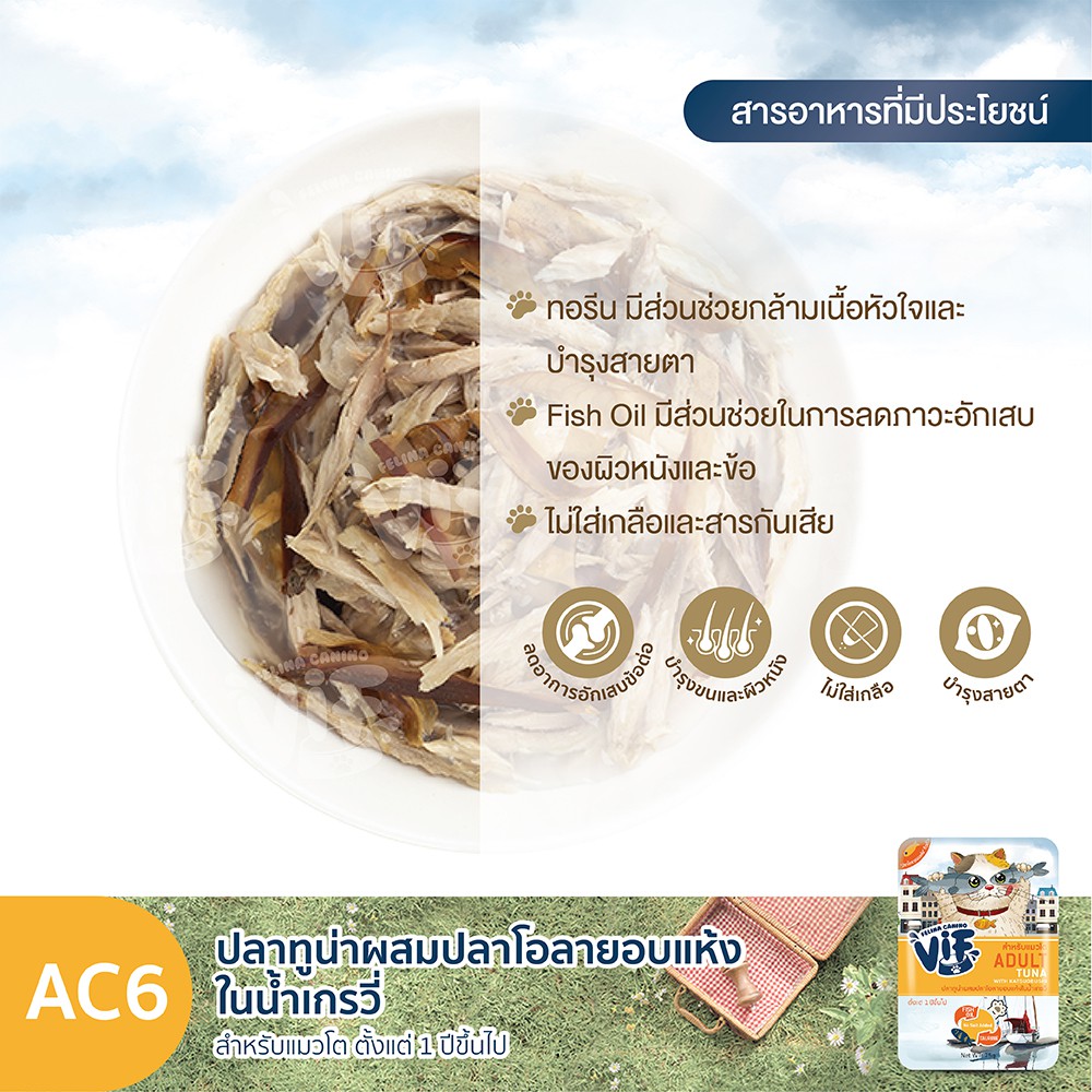 วิฟ (อาหารสำหรับแมว) : C6 ปลาทูน่าผสมปลาโอลายอบแห้งในน้ำเกรวี่ (สำหรับแมวโต)