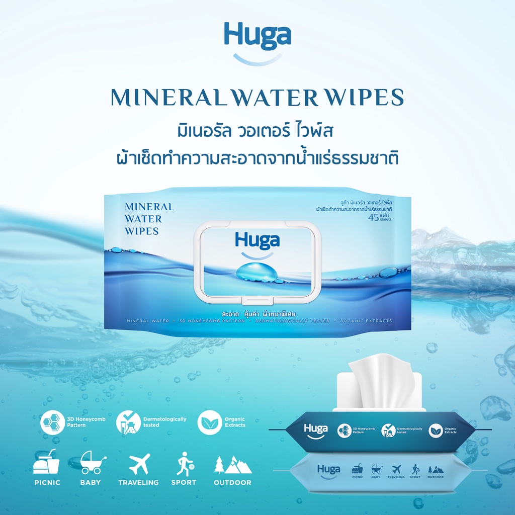 ฮูก้า ทิชชู่เปียก สูตรน้ำแร่ธรรมชาติ Huga Mineral Water Wipes 45 แผ่น (2 ชิ้น)