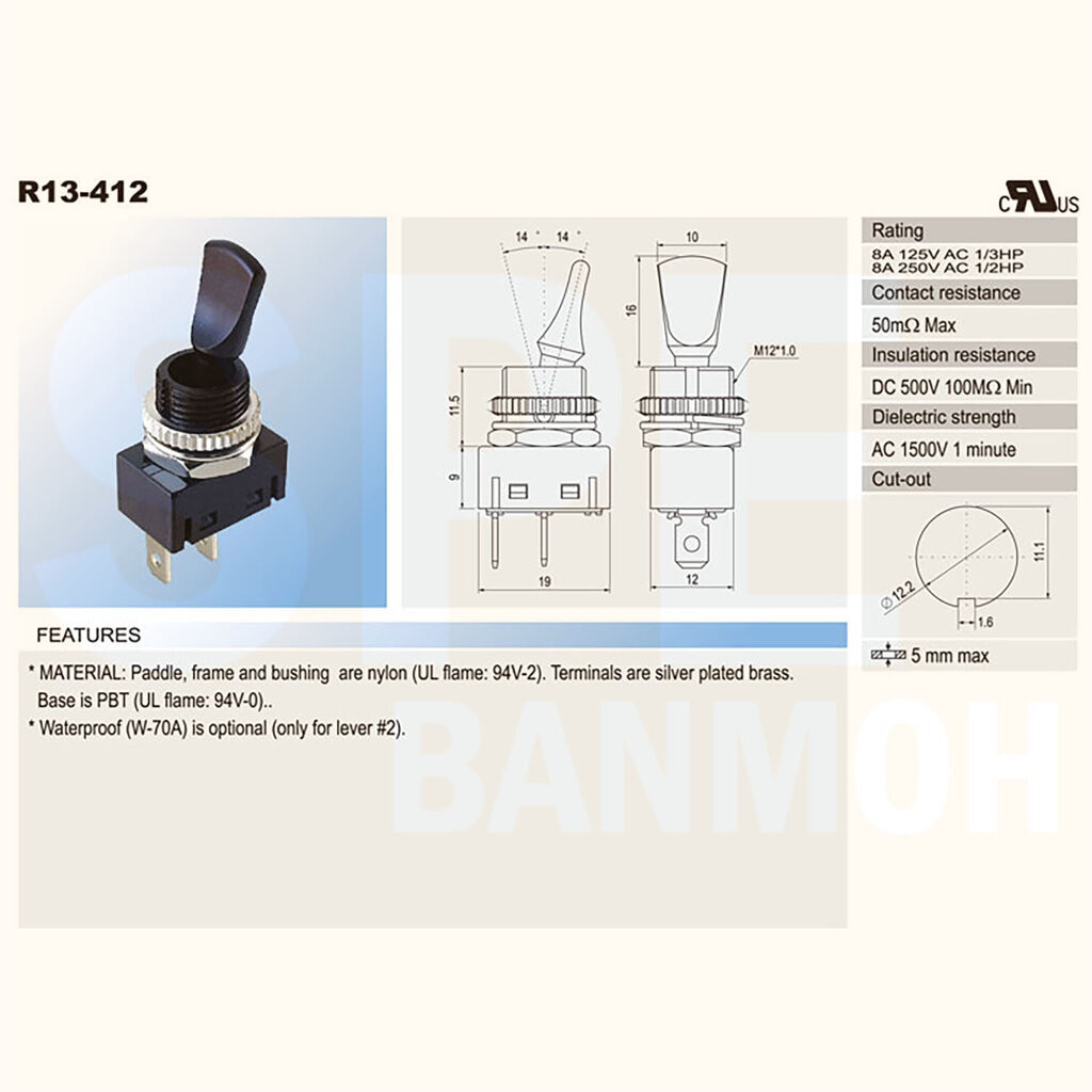 [ 1 ชิ้น ] R13-412 สวิทช์โยก 2 ขา Toggle Switch 2P ON-OFF ล็อคค้าง Maintain OFF-ON สวิทโยก 8A 250VAC ก้านแบน สวิทช์ ก...