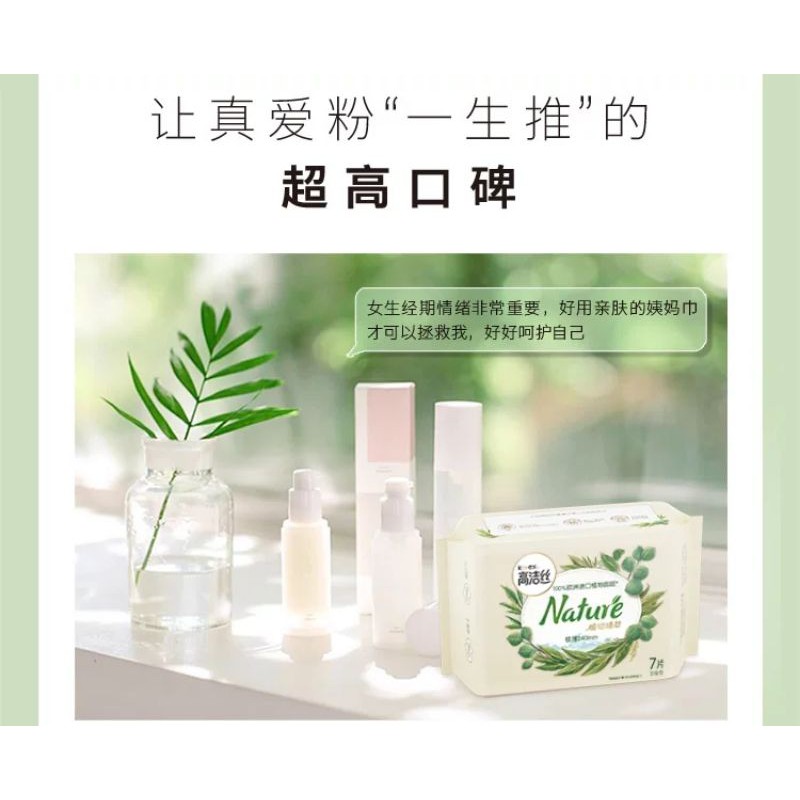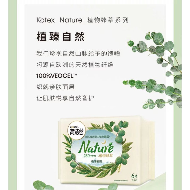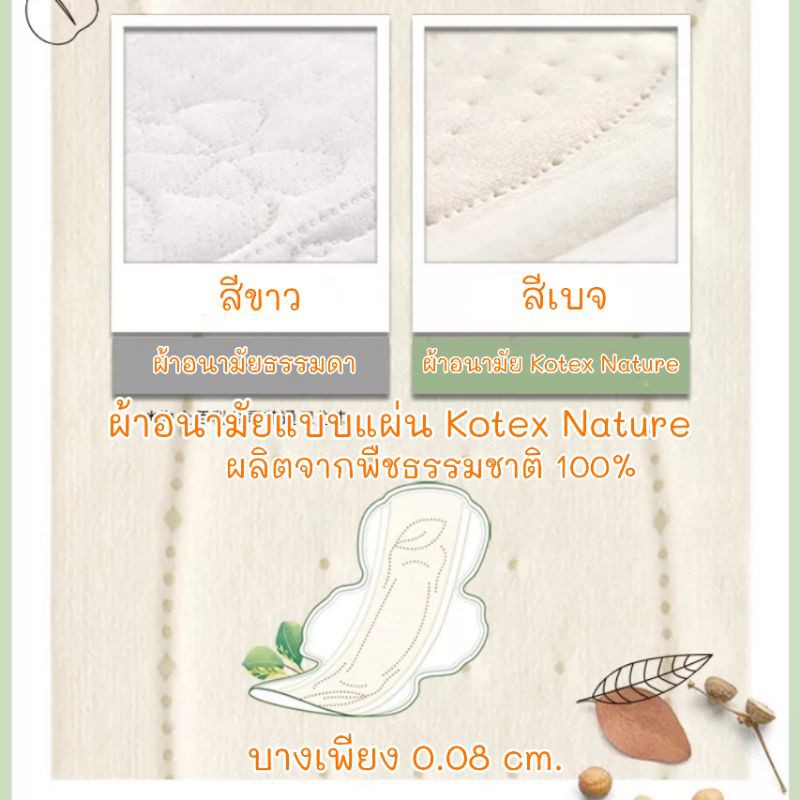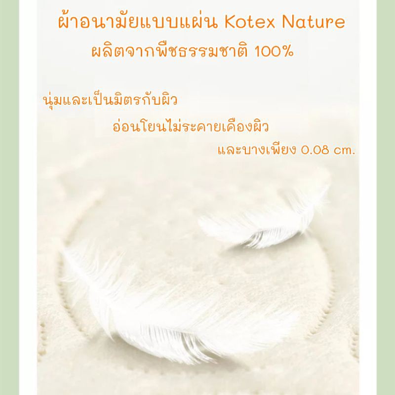 ผ้าอนามัยแบบแผ่น Kotex Nature ผลิตจากพืชธรรมชาติ 100% ย่อยสลายได้ อ่อนโยนไม่ระคายเคืองผิว บางเพียง0.08cm. ผ้าอนามัย