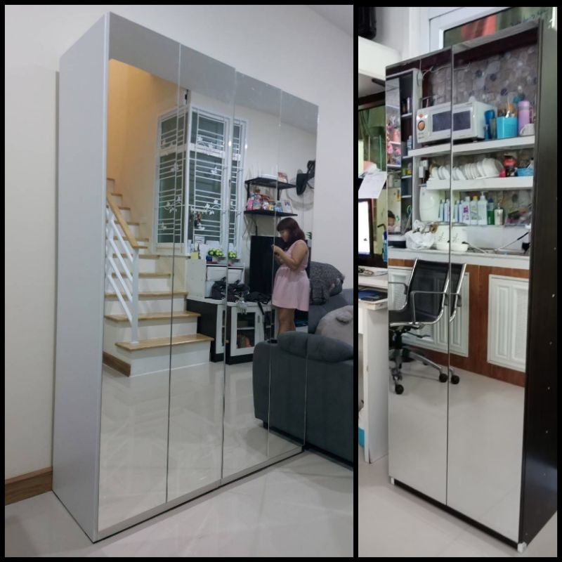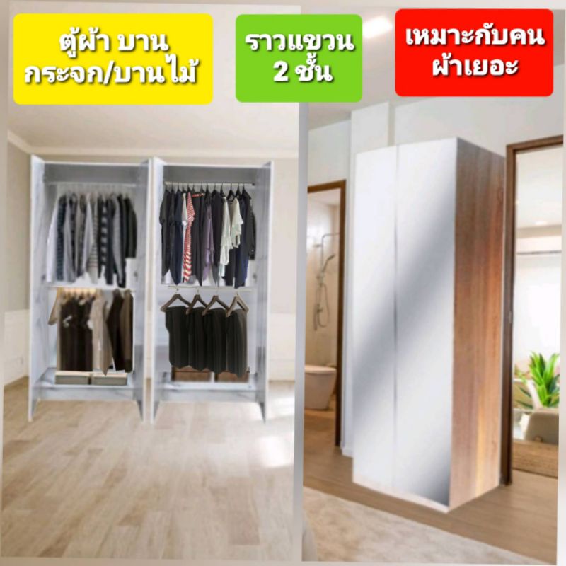 ตู้ผ้าจุ บานไม้/กระจก 2ราว เก็บผ้าเท่าตู้ 120cm ประหยัดที่คน