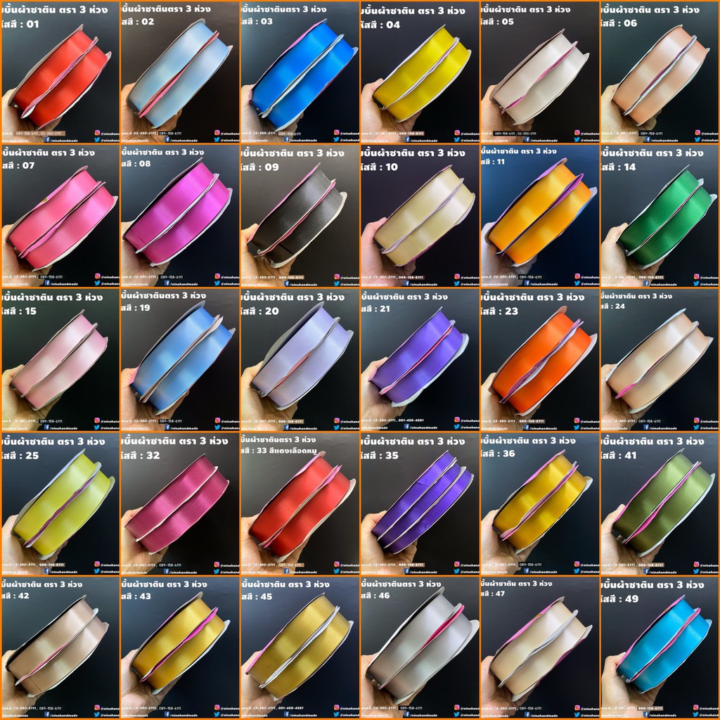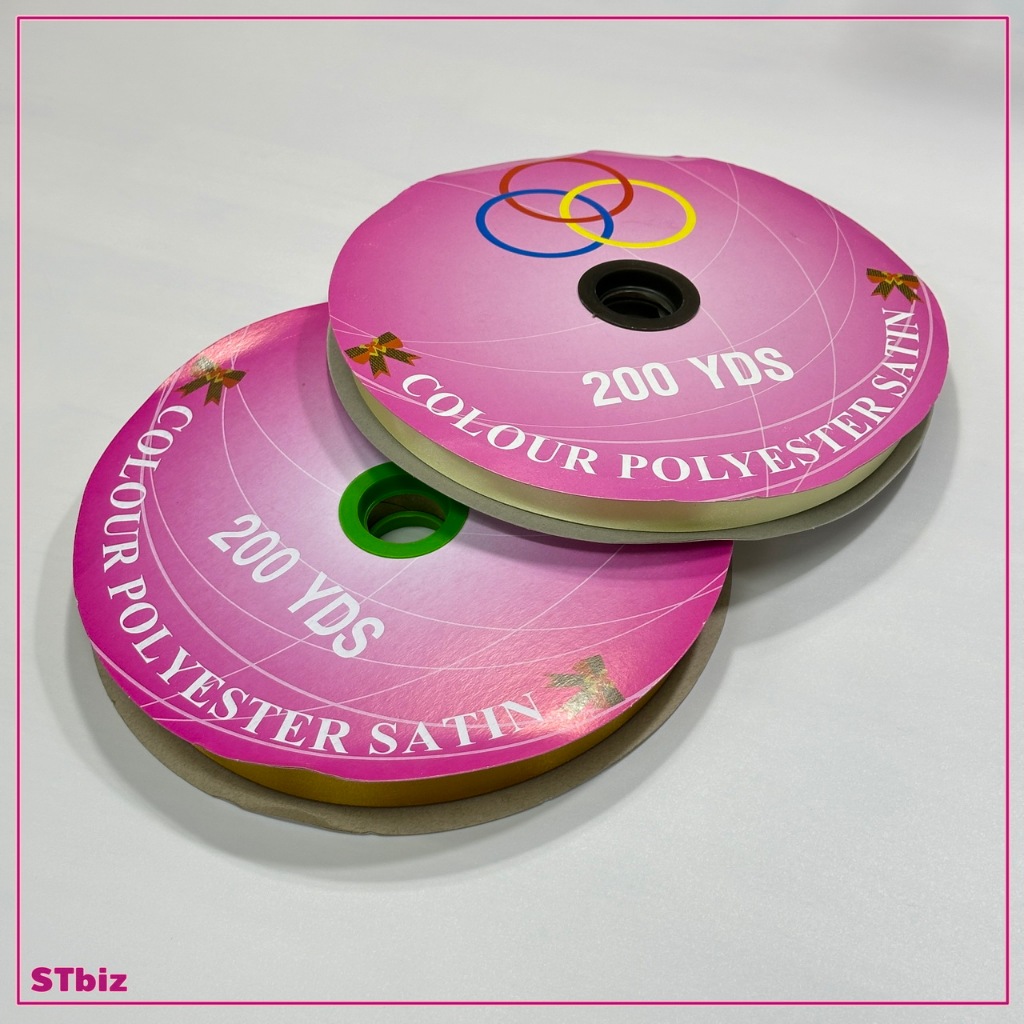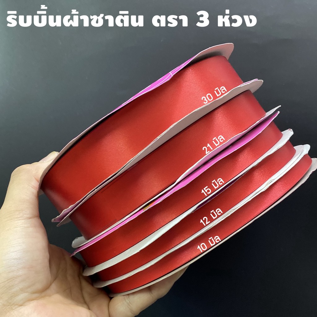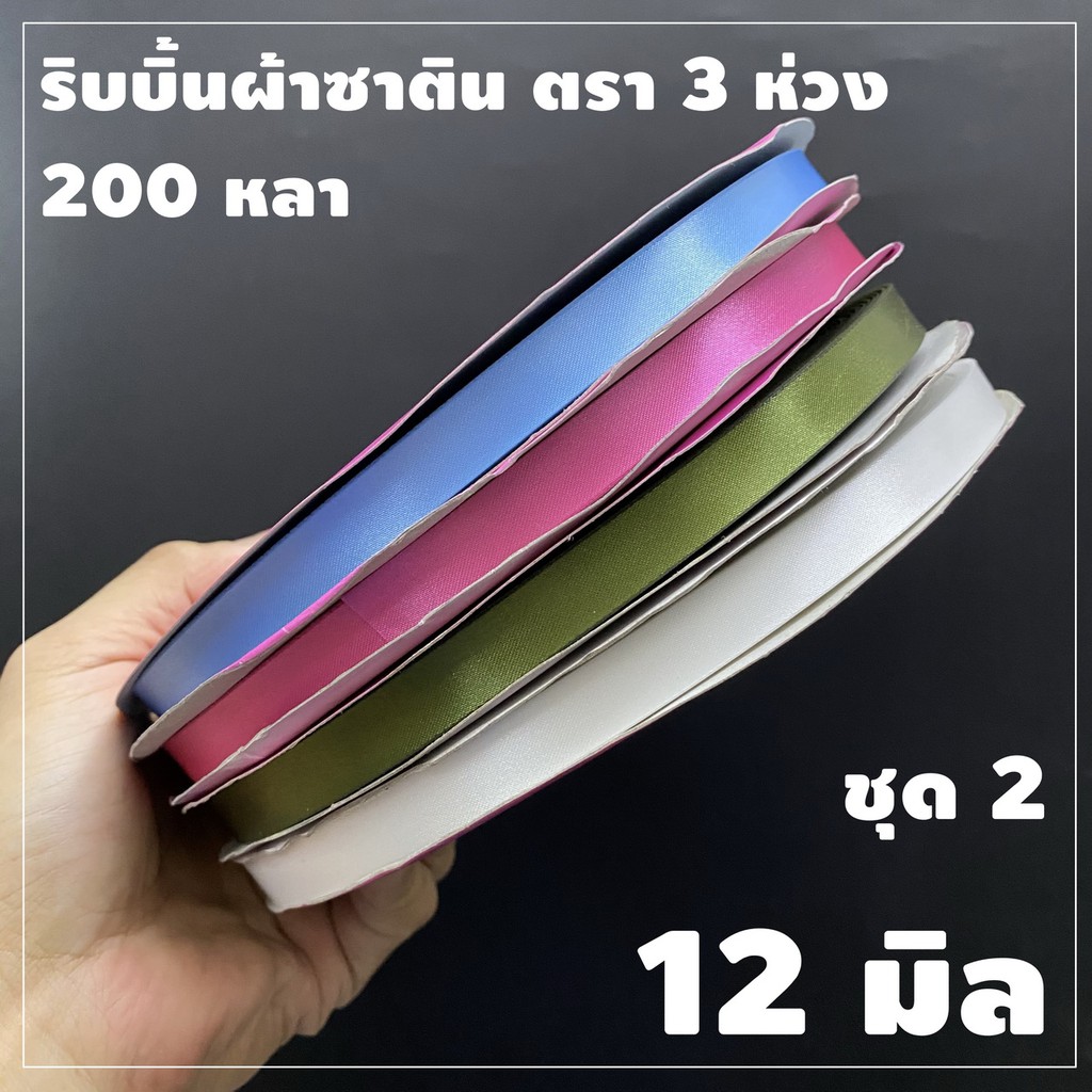 ริบบิ้นผ้า ตรา 3 ห่วง ขนาด 12 มิล X 200 หลา (1 ม้วน) ทำโบว์ของขวัญ ผูกช่อดอกไม้ ผูกกระเช้าผลไม้ ผ้ามีความมันวาวด้านเดียว