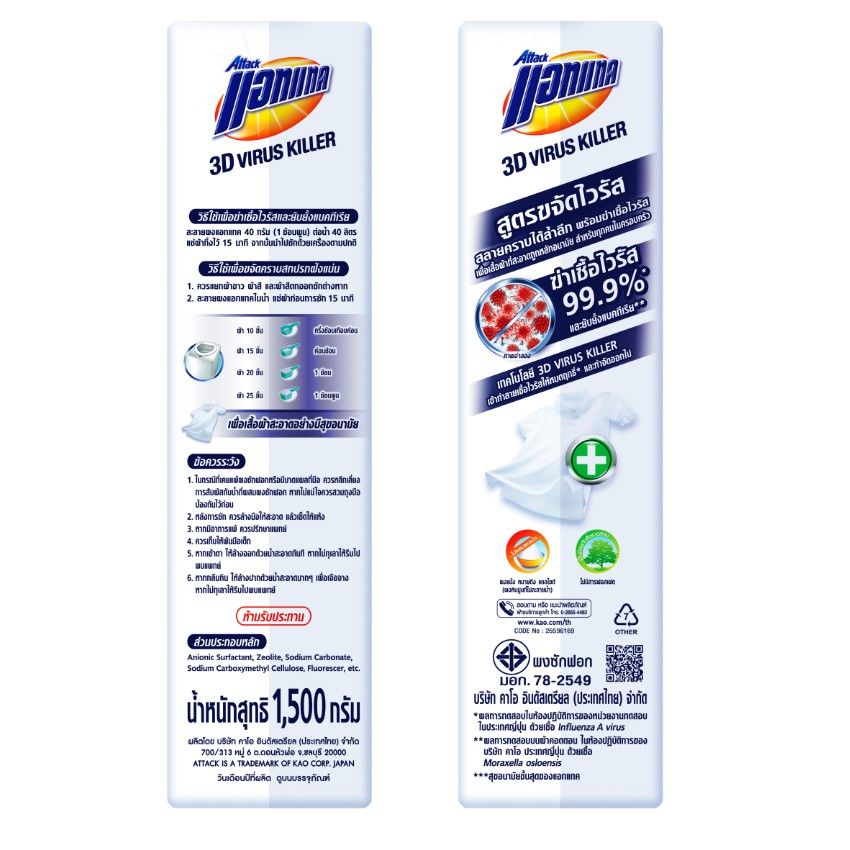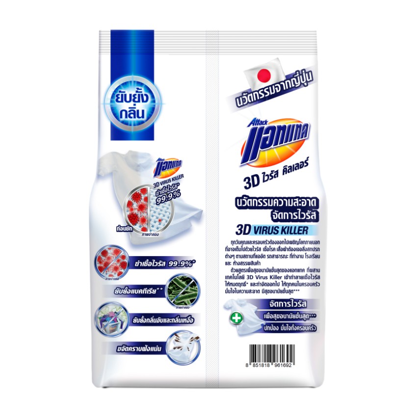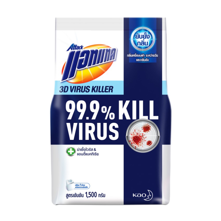 [ทั้งหมด 2 ถุง] แอทแทค 3D ไวรัส คิลเลอร์ ผงซักฟอก สูตรเข้มข้น ขนาด 1500 กรัม ATTACK 3D VIRUS KILLER 1500 G.
