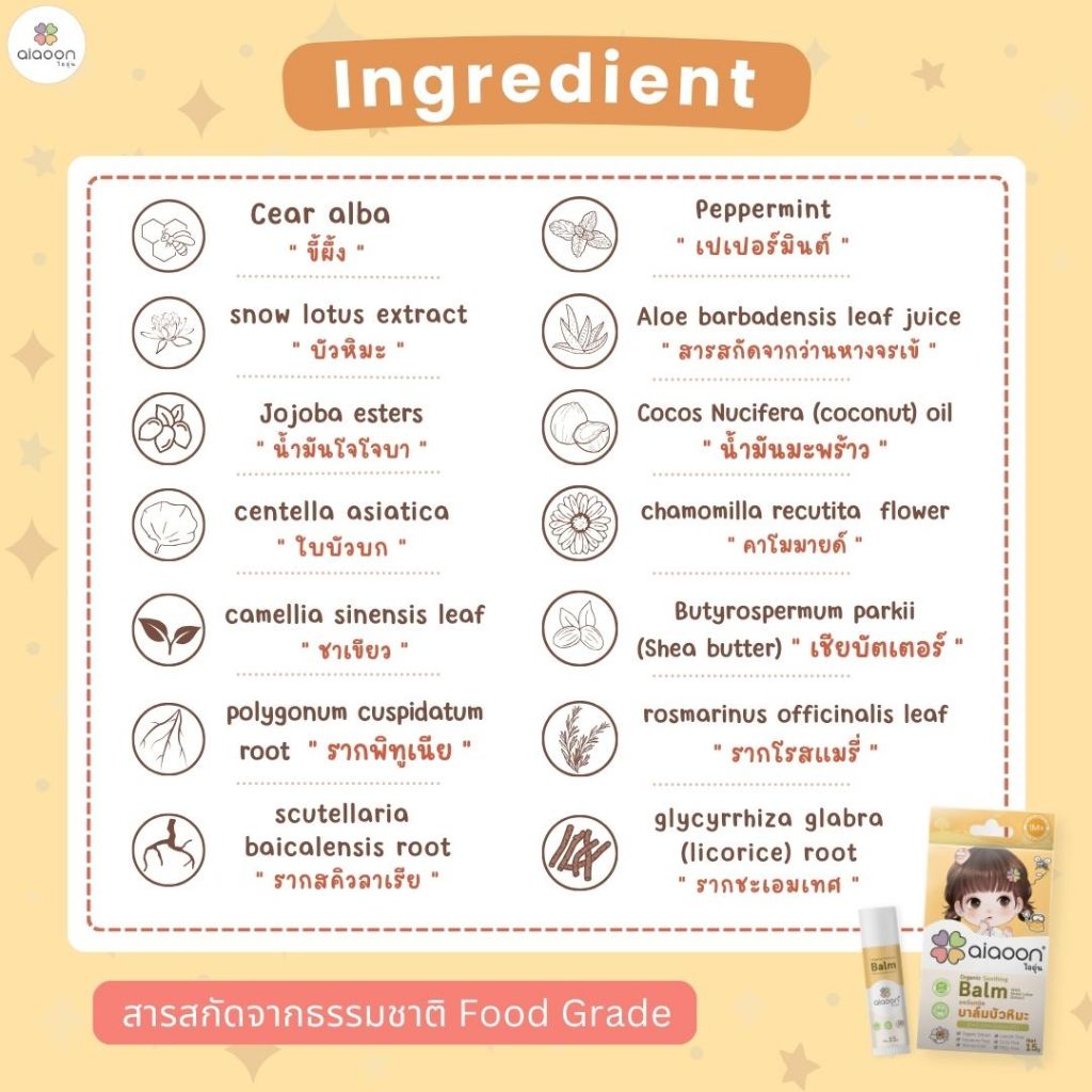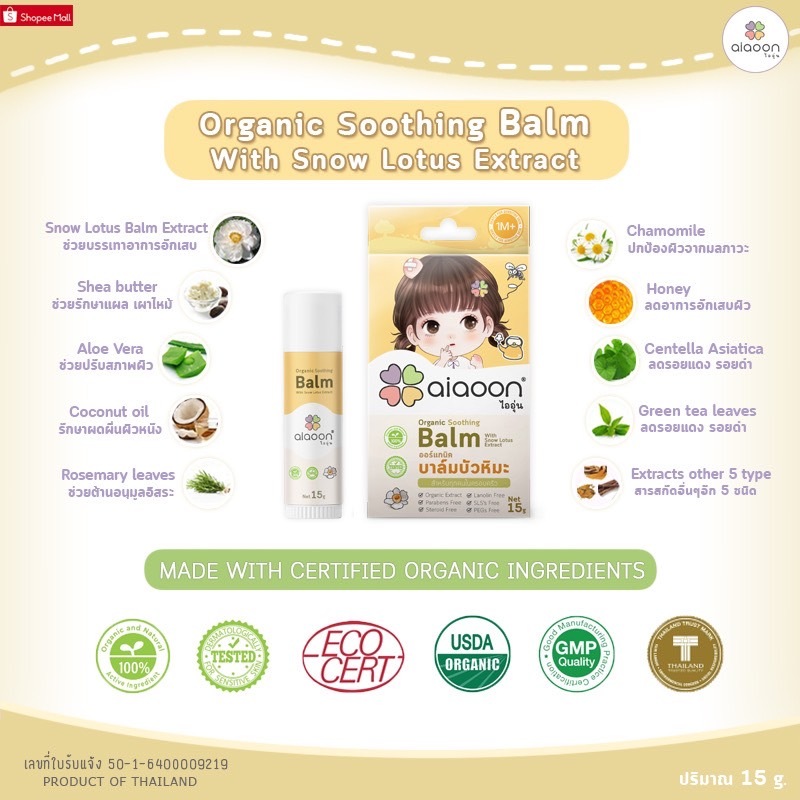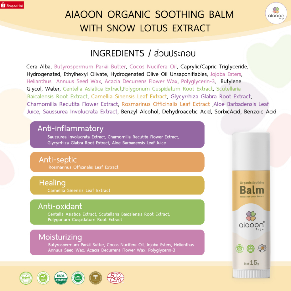 ไออุ่น บาล์มบัวหิมะออร์แกนิค 15 g.(aiaoon Organic Soothing Balm with Snow Lotus Extract)