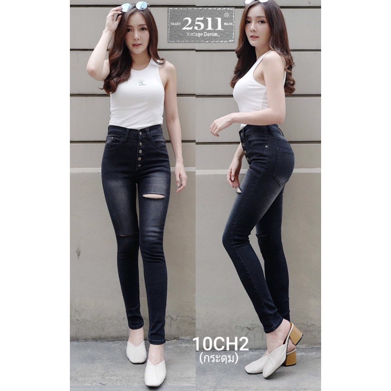 ลดราคา‼️ป้าย2511 กางเกงยีนส์ขาเดฟ ผ้ายืด แฟชั่นยีนส์สีดำแต่งขาด