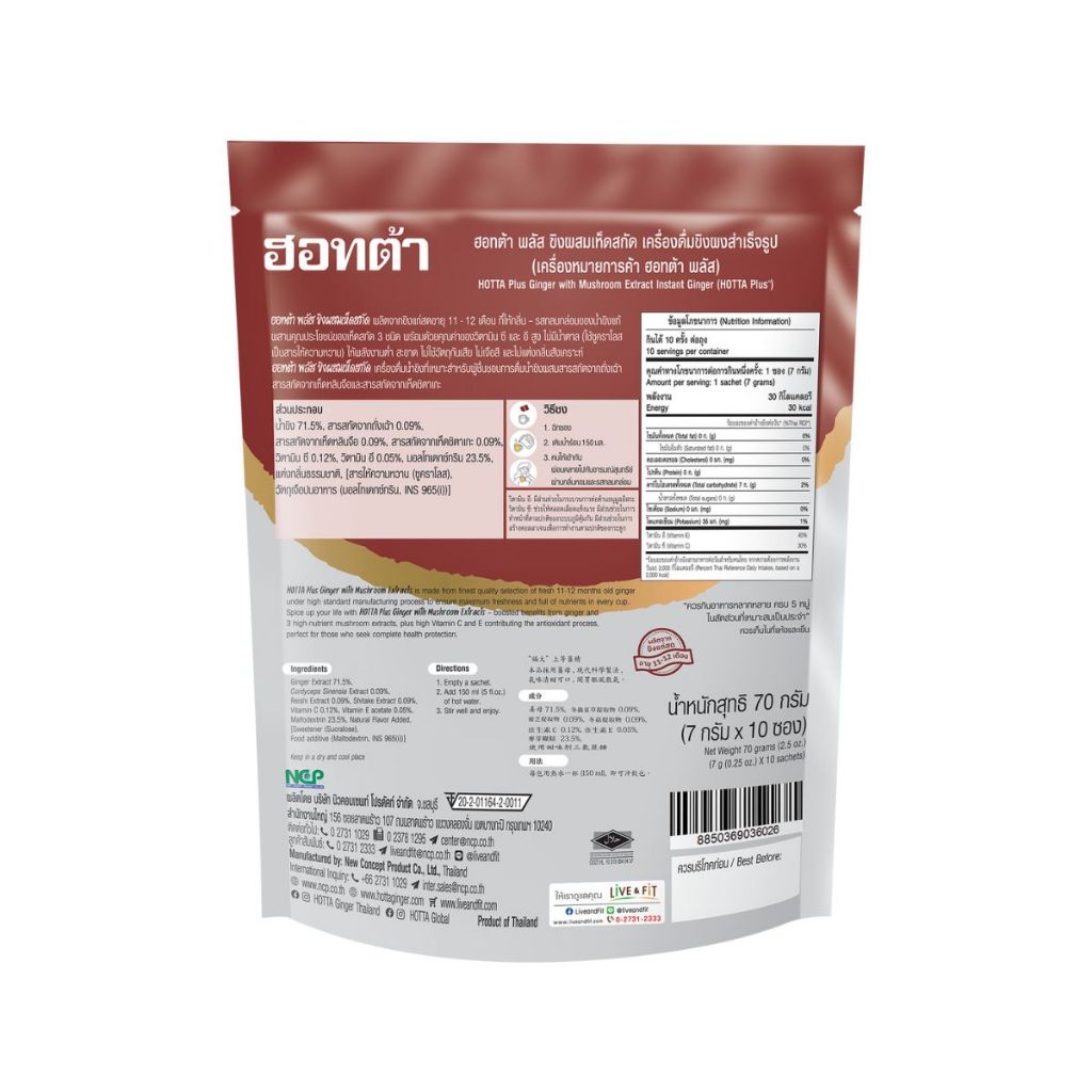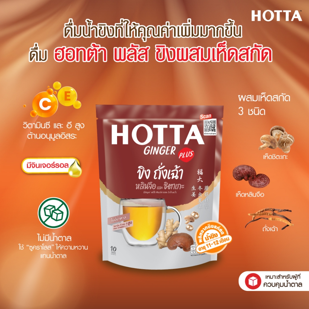 HOTTA น้ำขิง ฮอทต้า เครื่องดื่มขิงผงสำเร็จรูป ขิงถั่งเฉ้า หลินจือ และชิตาเกะ ขนาด 10 ซอง