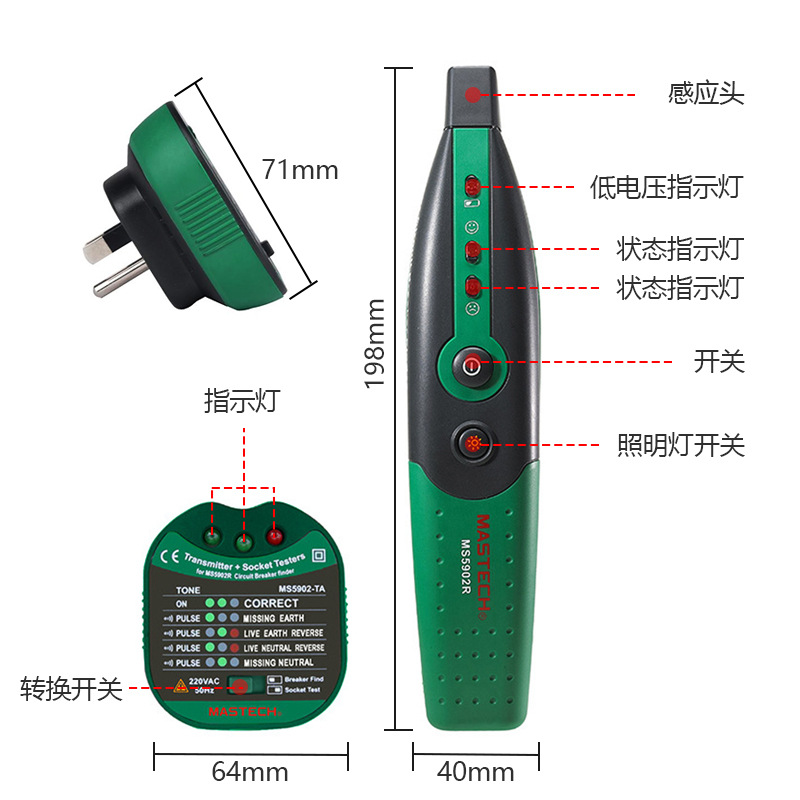 MASTECH MS5902 Automatic Circuit Breaker Finder Fuse Socket Tester 220V European specification with Flashlight