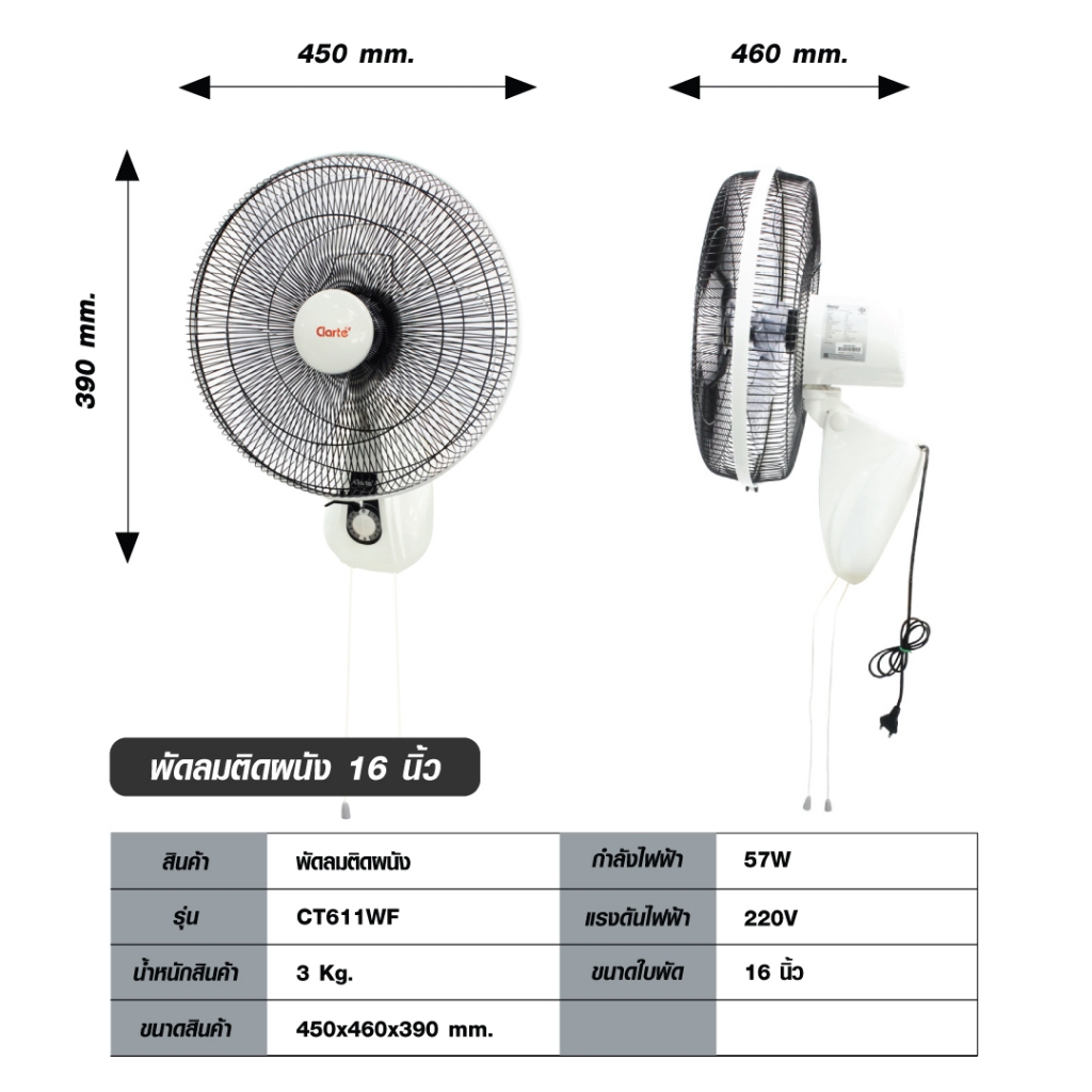 ๋Jaymarketพัดลมติดผนัง16นิ้วแบบ2เชื่อกClarte'รุ่นCT-611WFมอเตอร์57วัตต์สีขาว