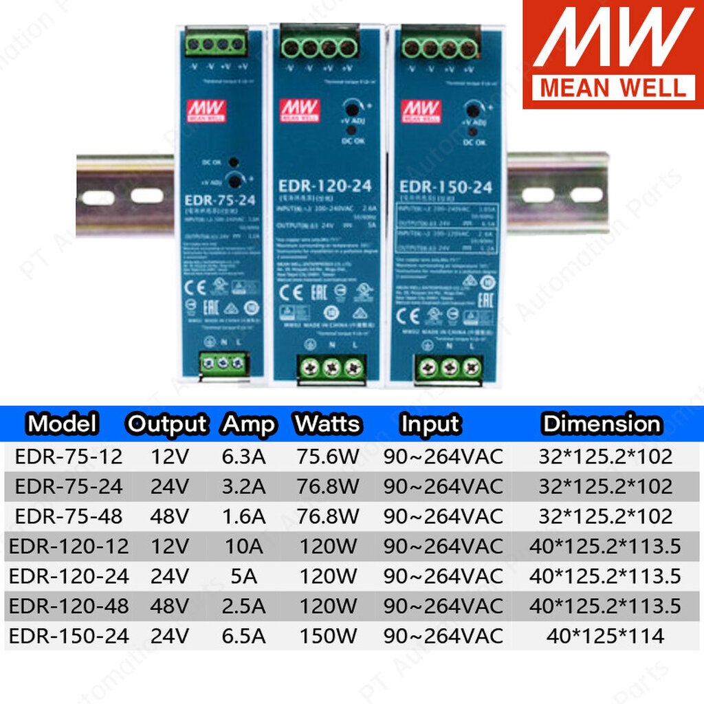 Switching Power Supply MEAN WELL EDR-75-24 EDR-120-24 EDR-150-24, 24VDC 3.2A 5A 6.5A 75W~150W AC to DC DIN RAIL สวิตช...