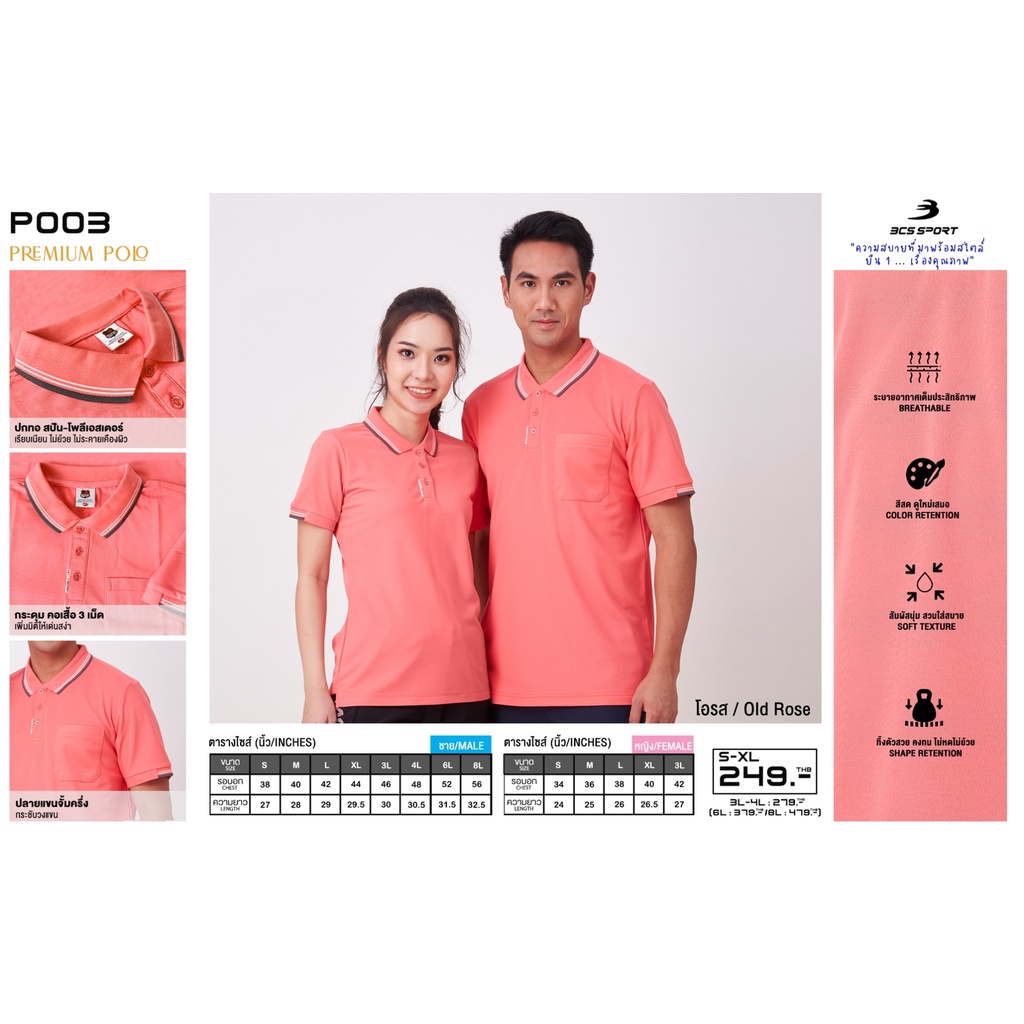 BCS SPORT เสื้อคอโปโลแขนสั้น PREMIUM POLO สีโอรส (มีไซส์ S-8L) รหัส P003 เนื้อผ้า MICRO POLYESTER