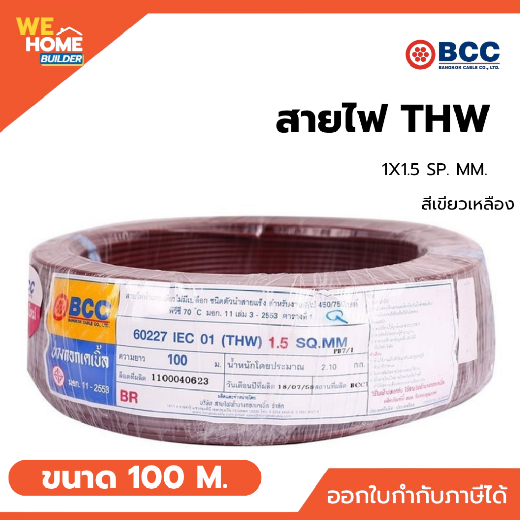BCC สายไฟ THW 1x1.5 ตร.มม. 60227 IEC 01 ม้วน 100 เมตร ทองแดงแท้ มอก. สายแข็ง แกนเดี่ยว