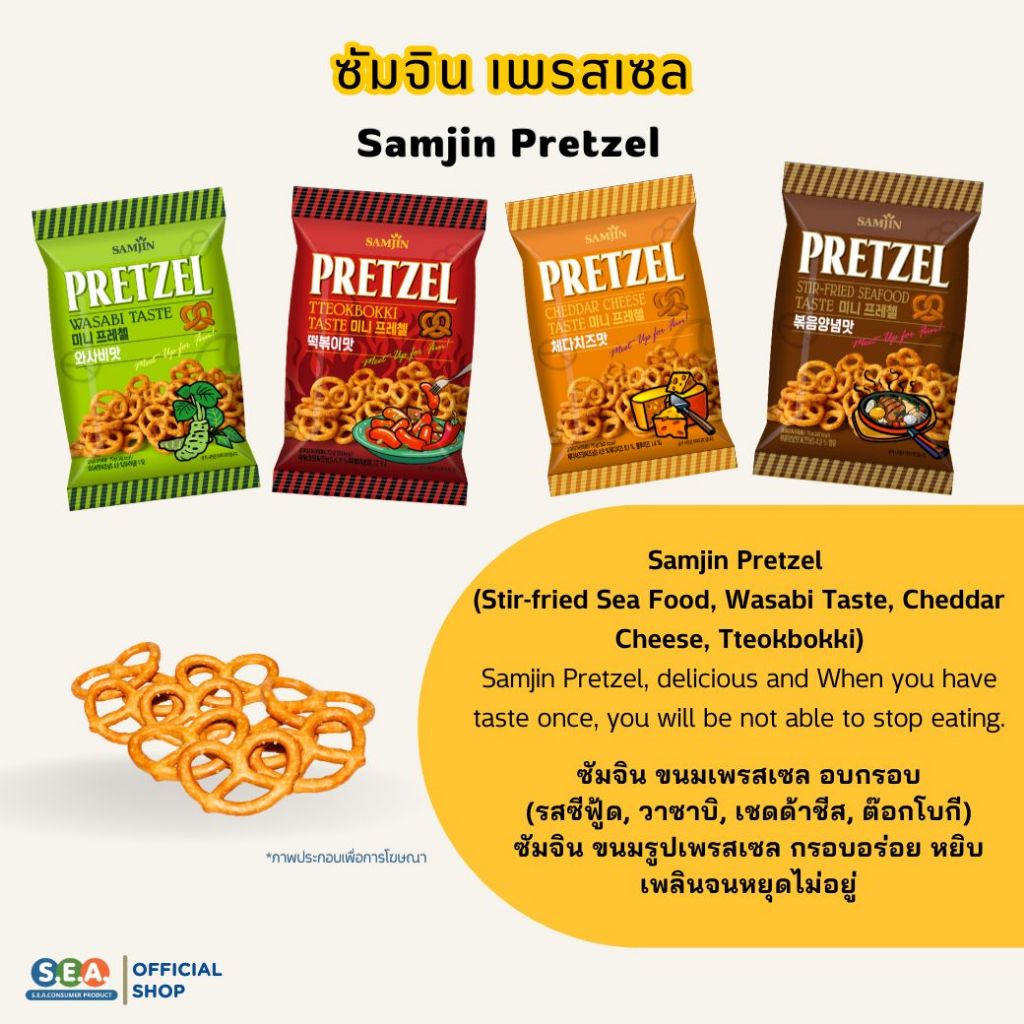 Samjin ซัมจิน เพรสเซลอบกรอบ รสซีฟู้ดสเตอร์ฟราย Pretzel Stir-Fried Seafood Taste 70g.|Exp: 17 Nov 2026