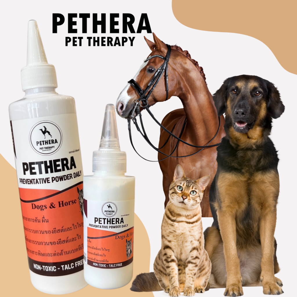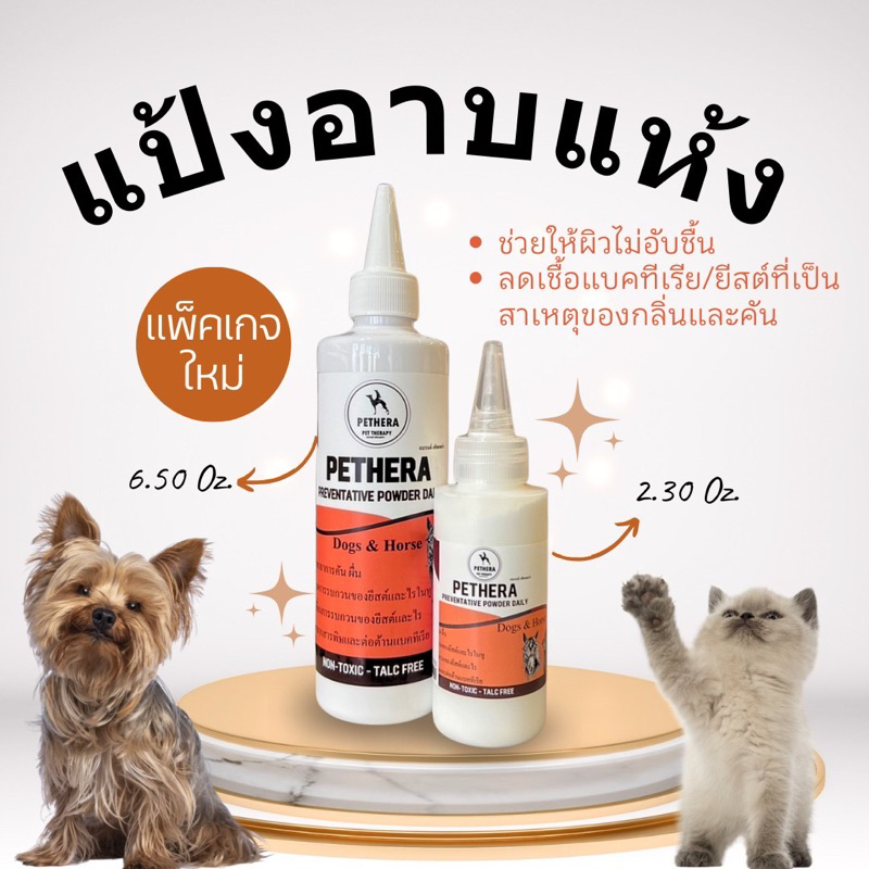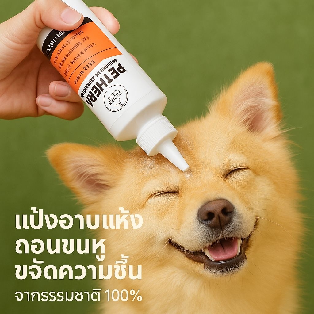 **แป้งโรยตัวอาบแห้งถอนขนหูสุนัข** ใช้โรยให้ทั่วผิวและเส้นขน ป้องกันเชื้อรา ขจัดกลิ่นและคราบไขมันได้ดีเยี่ยม