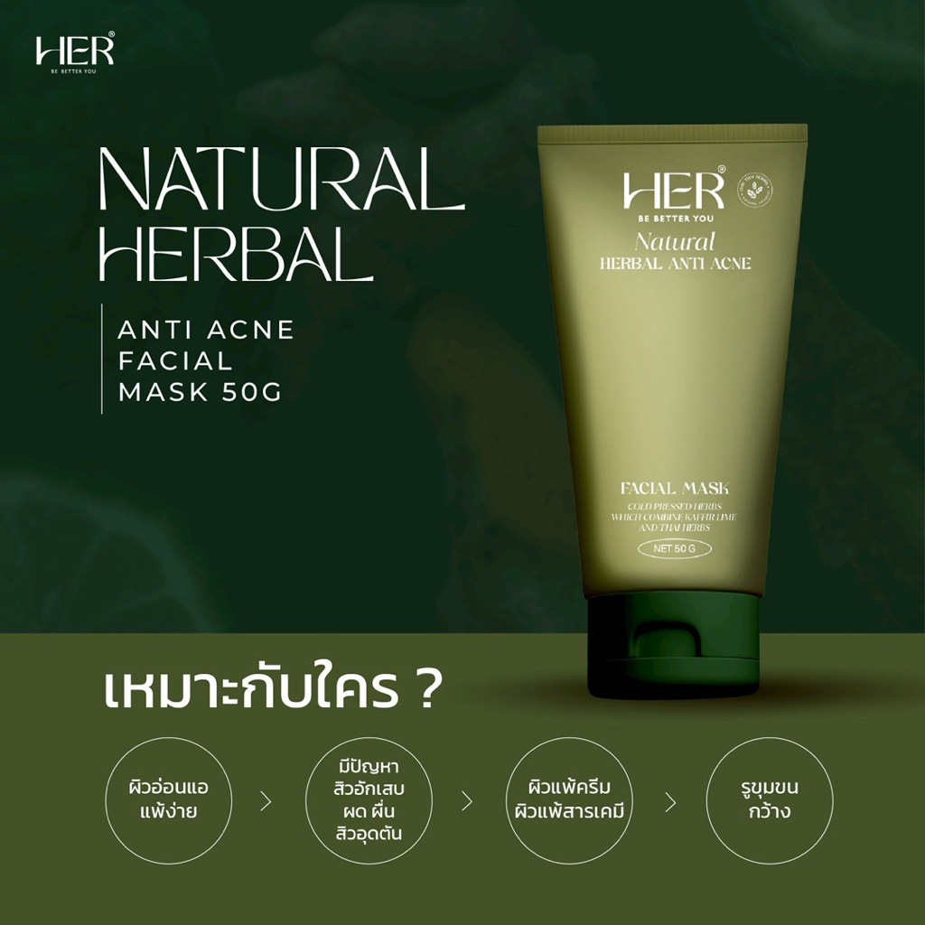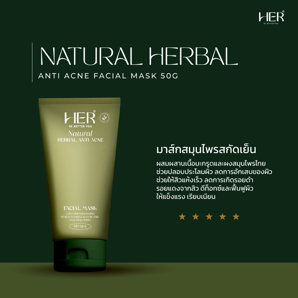 Her Natural Herbal Anti Acne Mask มาส์กสมุนไพรลดสิว ดีท็อกซ์ผิว ลดสิวอุดตัน สิวแห้งไว คุมมัน (50g)