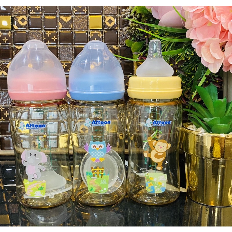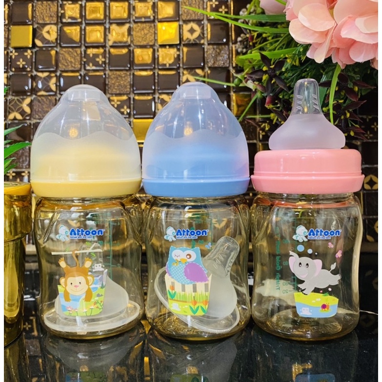 Newขวดนมคอกว้างสีชาATTOON 4zo.8zo.มาพร้อม จุกนมคุมการไหลมาตราฐานด้วยปริมาณรูป้องกันการเกิดโคลิค