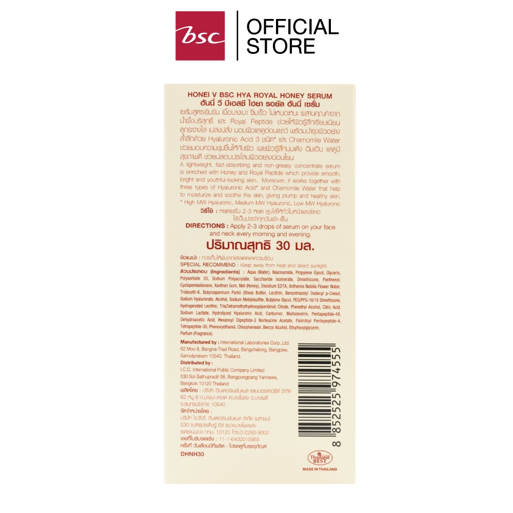 HONEI V BSC HYA ROYAL HONEY SERUM 30 มล. เซรั่มน้ำผึ้ง&ไฮยาสูตรเข้มข้น เนื้อบางเบา ซึมเร็ว ไม่เหนอะหนะ บูสต์ผิวเนียนใส