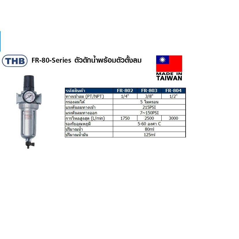 THB ชุดตัวดักน้ำพร้อมตัวตั้งลม THB ขนาดเกลียว 1/4" รุ่น THB#FR-802 3/8"รุ่น THB#FR-803 และ 1/2" รุ่น THB# FR-804