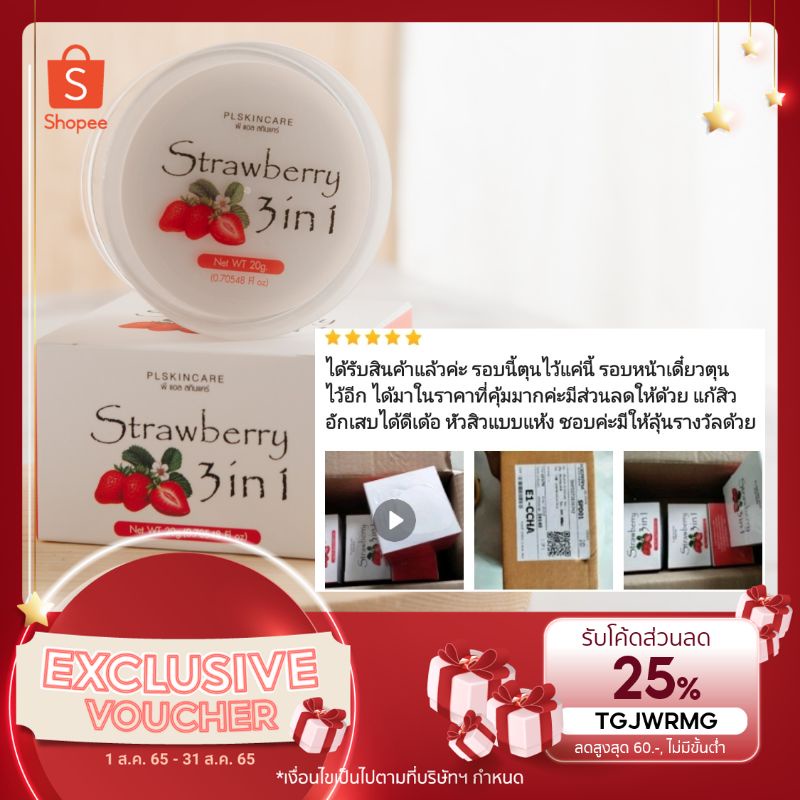 PL Skincare Strawbery3in1 สตรอเบอร์รี่ ลดสิว คุมมัน ผิวขาวใสอมชมพู กลิ่นสตรอเบอรี่หอมผ่อนคลาย สตรอทรีอินวัน ปุกใหญ่ 20g.