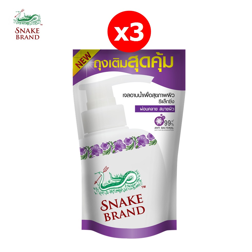 Snake Brand เจลอาบน้ำตรางู สูตรเย็น รีแล็กซิ่ง 450 มล. x3 ฟรี ถุงเติม 400 มล.3 ถุง (ครีมอาบน้ำ, Relaxing Shower Gel)