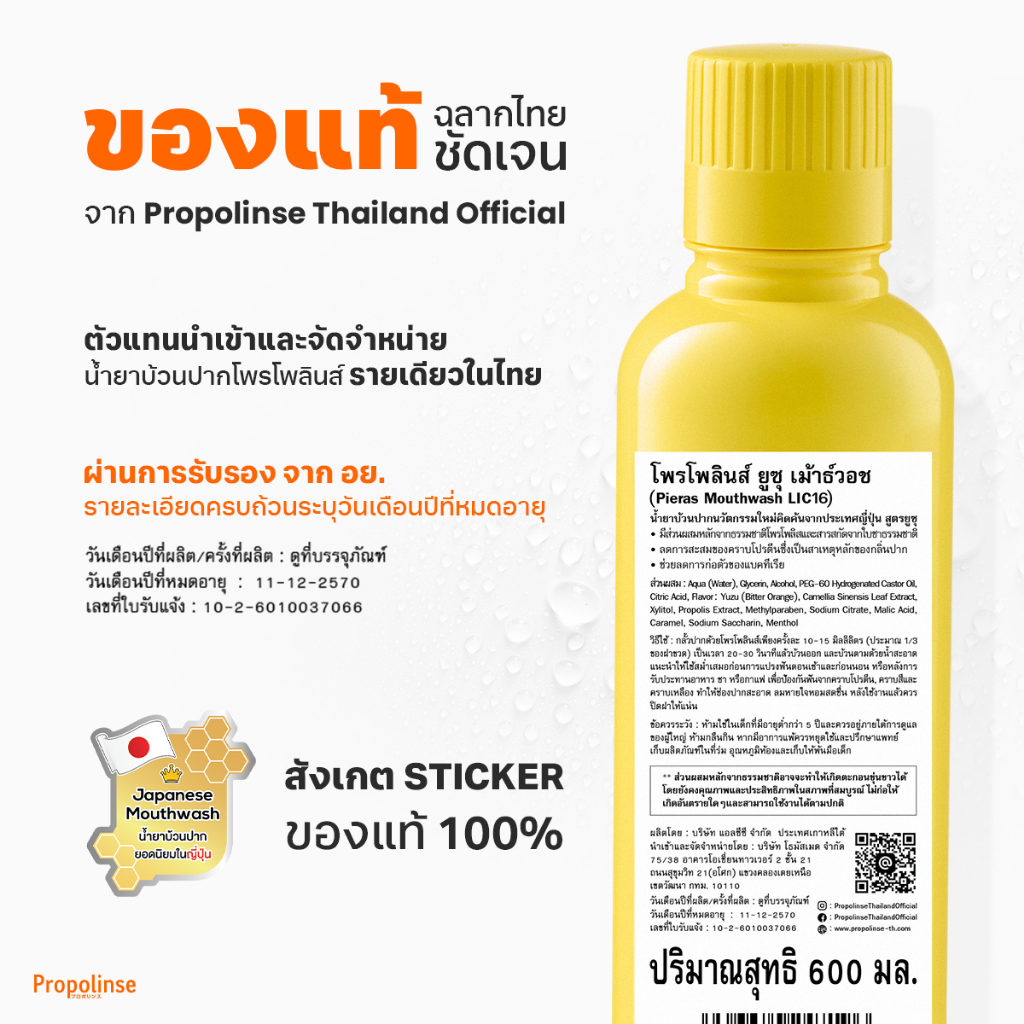 Propolinse โพรโพลินส์ น้ำยาบ้วนปาก ยูซุ แพคคู่ 600มล. + 150มล.