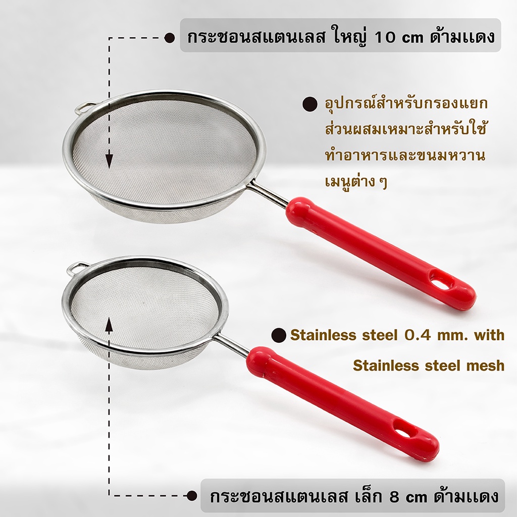 กระชอนสเตนเลส ด้ามแดง 8 ซม และ 10 ซม. (เครื่องครัวตราสมอ) ตาข่ายละเอียด ด้ามจับอย่างหนา