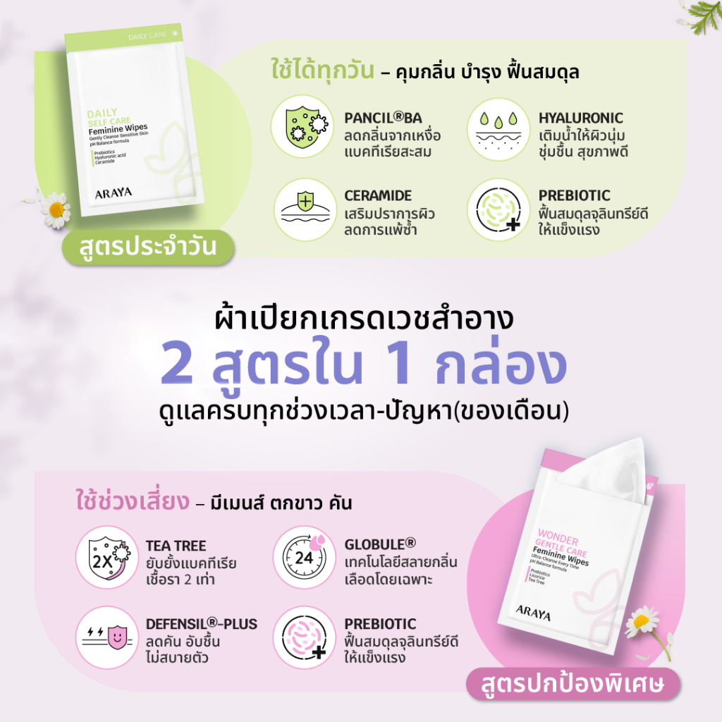 (W) ARAYA ผ้าเปียก 2 สูตรดูแลจุดซ่อนเร้น — สำหรับทุกวัน และวันเสี่ยง สะอาด อ่อนโยน ฟื้นสมดุล เสริมปราการผิว