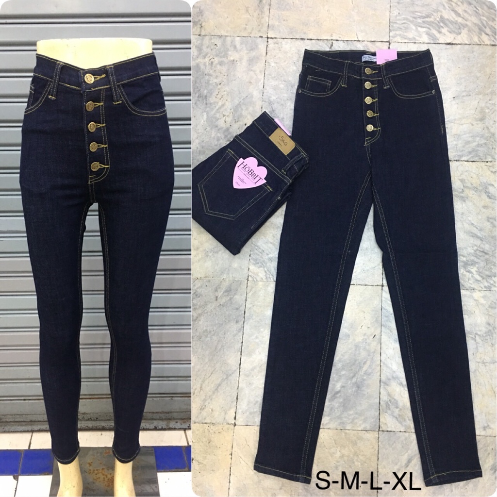 กางเกงยีนส์ผู้หญิง เอวสูง กระดุมโชว์ ทรงเดฟยืด สีดำ ไซส์ S-38