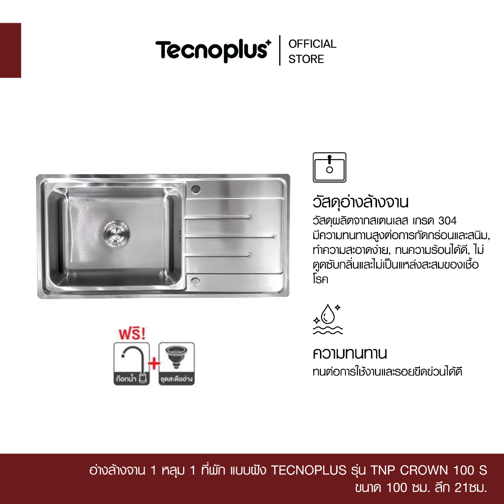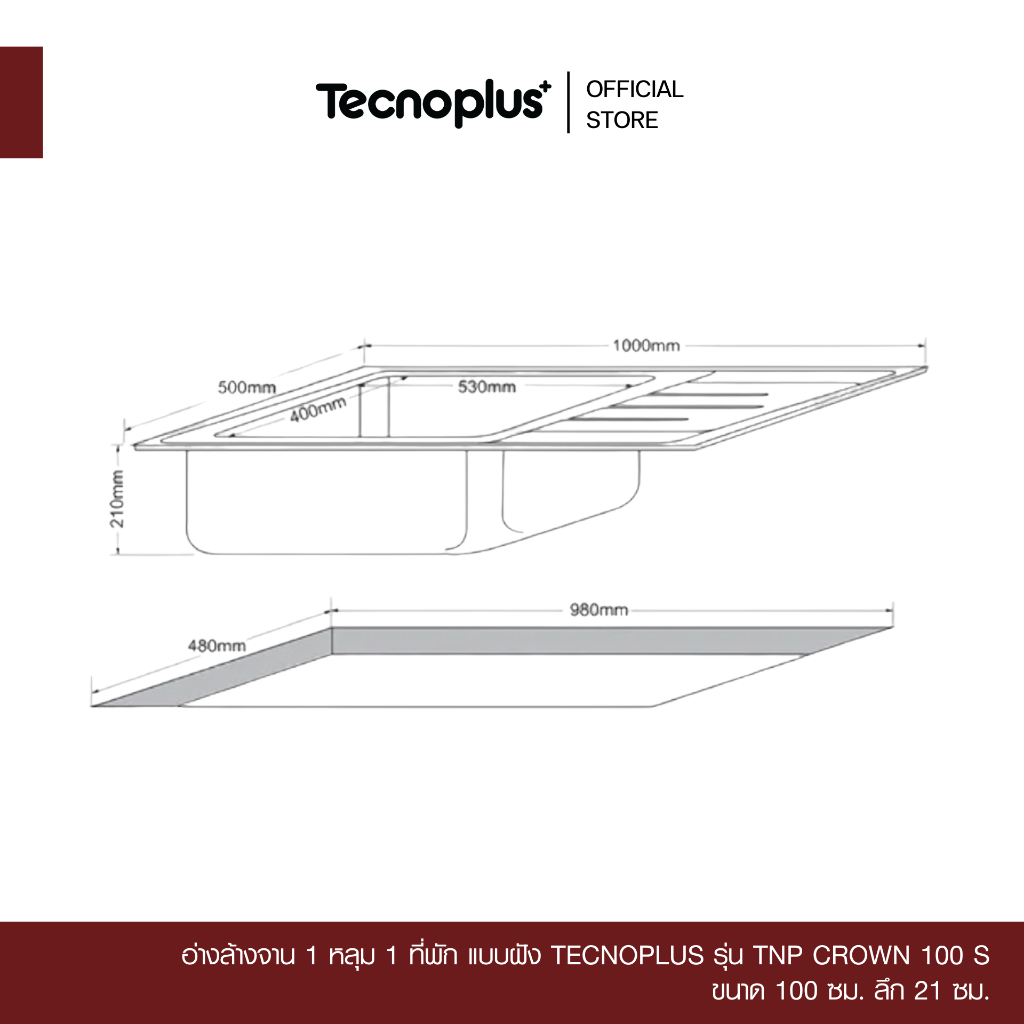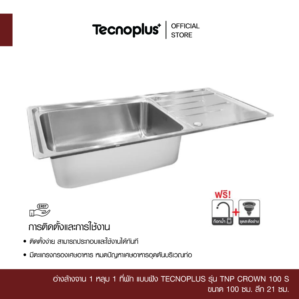 อ่างล้างจาน 1 หลุม 1 ที่พัก แบบฝัง Tecnoplus รุ่น TNP CROWN 100 S ขนาด 100 ซม. ลึก 21 ซม.