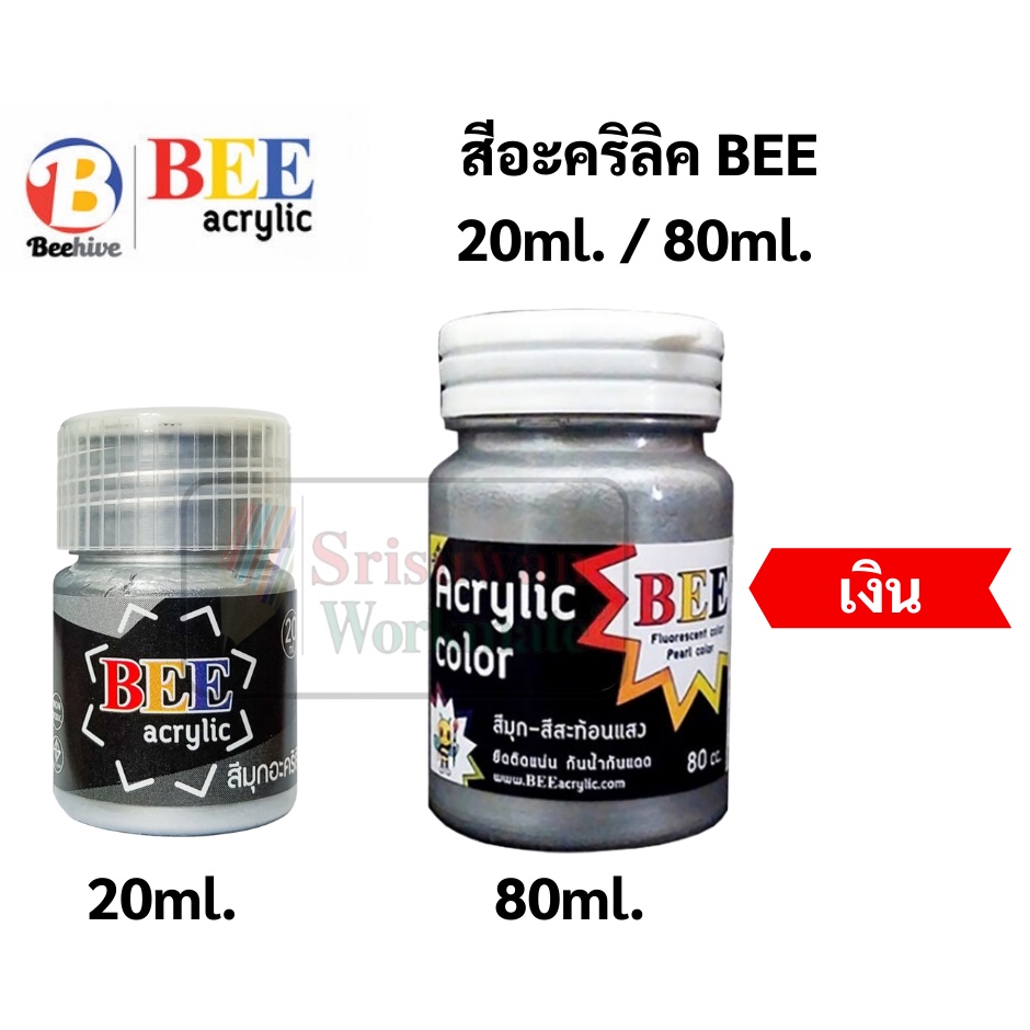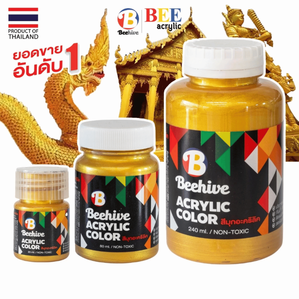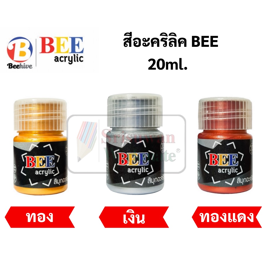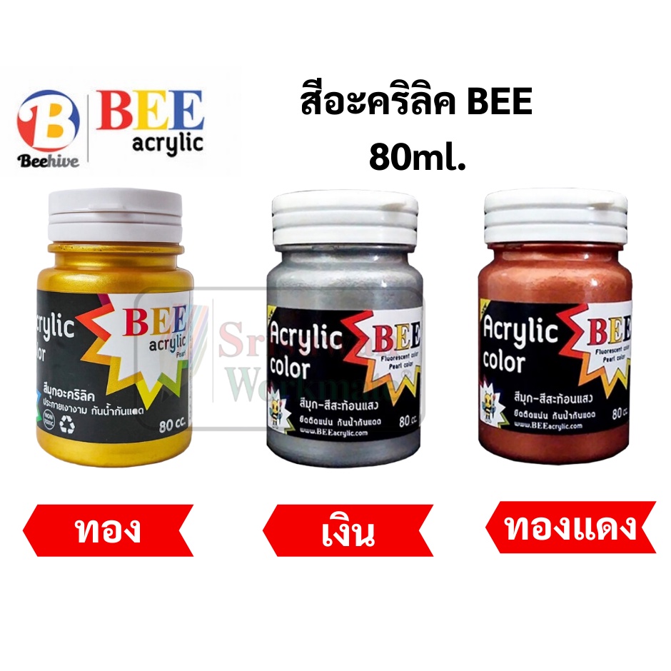 สีอะคริลิค BEE สีทอง เงิน ทองแดง 80 ml. / 20 ml. กันน้ำ Acrylic Color สีทาพญานาค สีทาวัด ประกายเงา สีเพ้นท์ผ้า